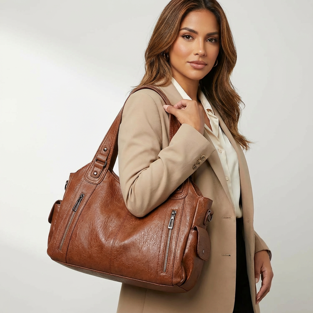✓ Vegan leer – Luxe uitstraling met een soepel, licht gestructureerd oppervlak ✓ Veilige sluiting – Bovenzijde met ritssluiting houdt je spullen goed beschermd ✓ Verstelbare schouderband – Draag als schoudertas of crossbody ✓ Slimme indeling – Meerdere binnen- en buitenvakken voor extra overzicht ✓ Stabiele bodem – Platte onderzijde zorgt dat de tas rechtop blijft staan