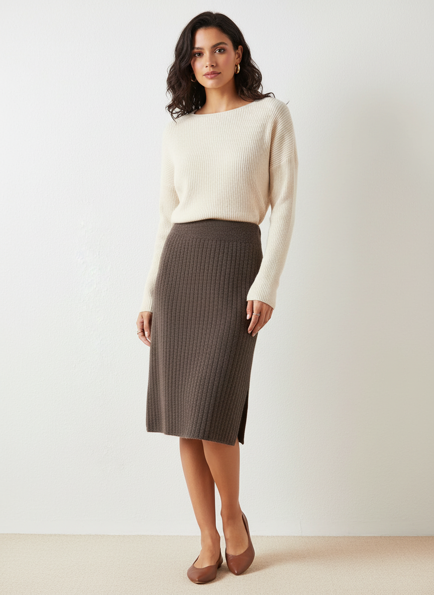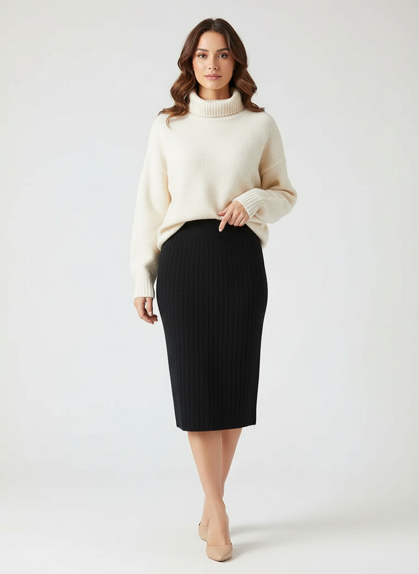 Deze rok is een verfijnd item dat moeiteloos comfort en klasse combineert. De midi-lengte en aansluitende vorm zorgen voor een elegante look die het silhouet mooi volgt, terwijl de zachte, warme stof prettig aanvoelt op de huid. Perfect voor stijlvolle everyday outfits, maar ook ideaal voor meer geklede momenten. Een veelzijdig ontwerp dat rust en luxe uitstraalt.