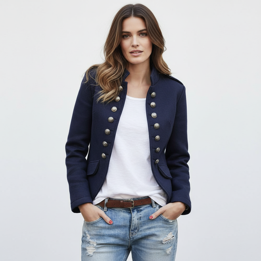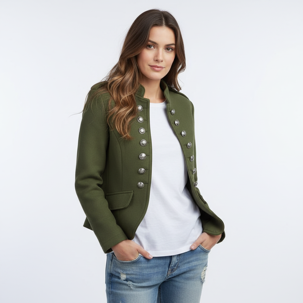 Deze blazer is ontworpen voor vrouwen die houden van een krachtige maar toegankelijke uitstraling. Het militaire geïnspireerde ontwerp met decoratieve knopen en een subtiele staande kraag geeft deze blazer karakter, terwijl de slanke pasvorm zorgt voor een vrouwelijk silhouet. Ideaal voor de overgangsperiode: licht, comfortabel en makkelijk te combineren met zowel jeans als een nette broek of rok. Een item dat je moeiteloos draagt naar werk, een lunchafspraak of een casual avond uit.