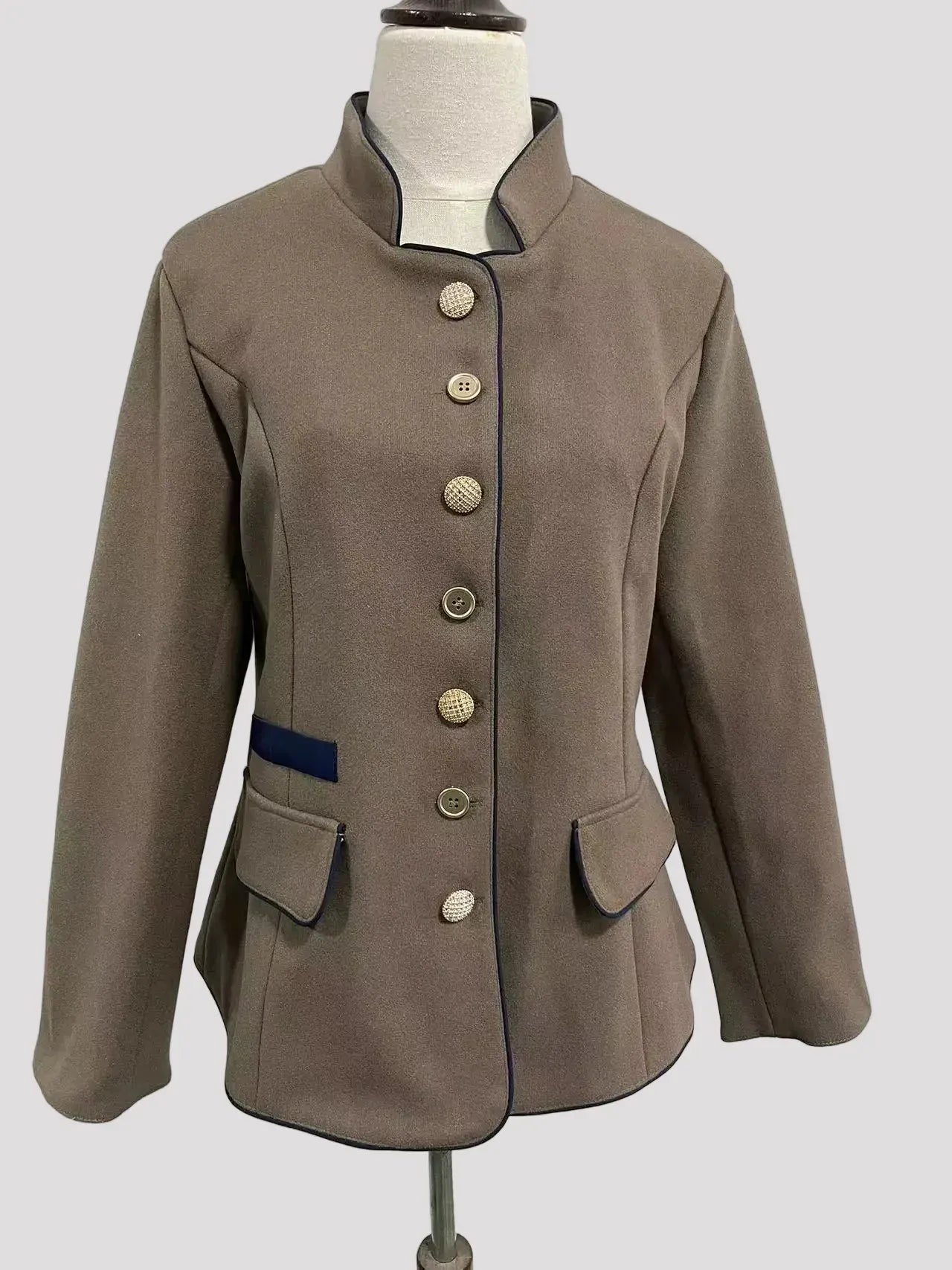 Details: Luxe knopen, staande kraag, voorzakken met klep
