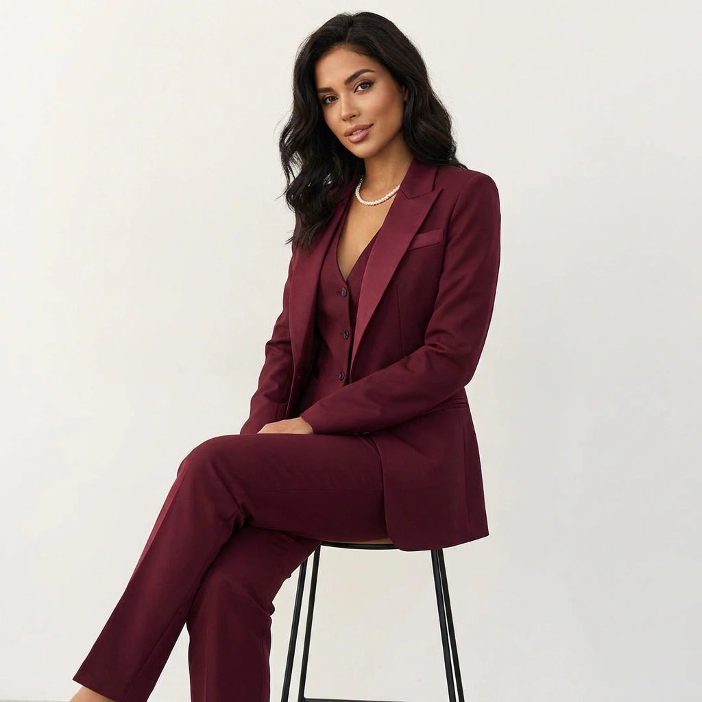 Dit ontwerp is gemaakt voor vrouwen die er direct verzorgd en zelfverzekerd uit willen zien. De combinatie van blazer, gilet en pantalon creëert een elegante gelaagde look die luxe uitstraalt, zonder stijf te voelen. De pasvorm valt flatterend en modern, waardoor je dit pak net zo makkelijk draagt naar een zakelijke afspraak als naar een stijlvolle gelegenheid.
