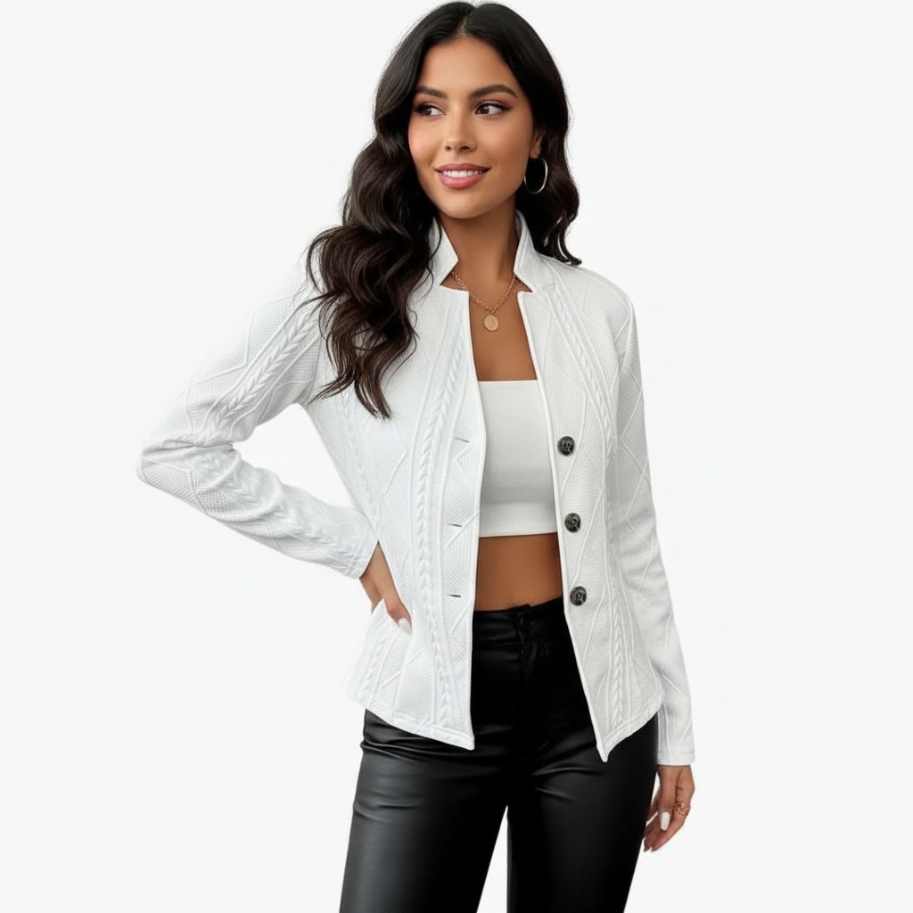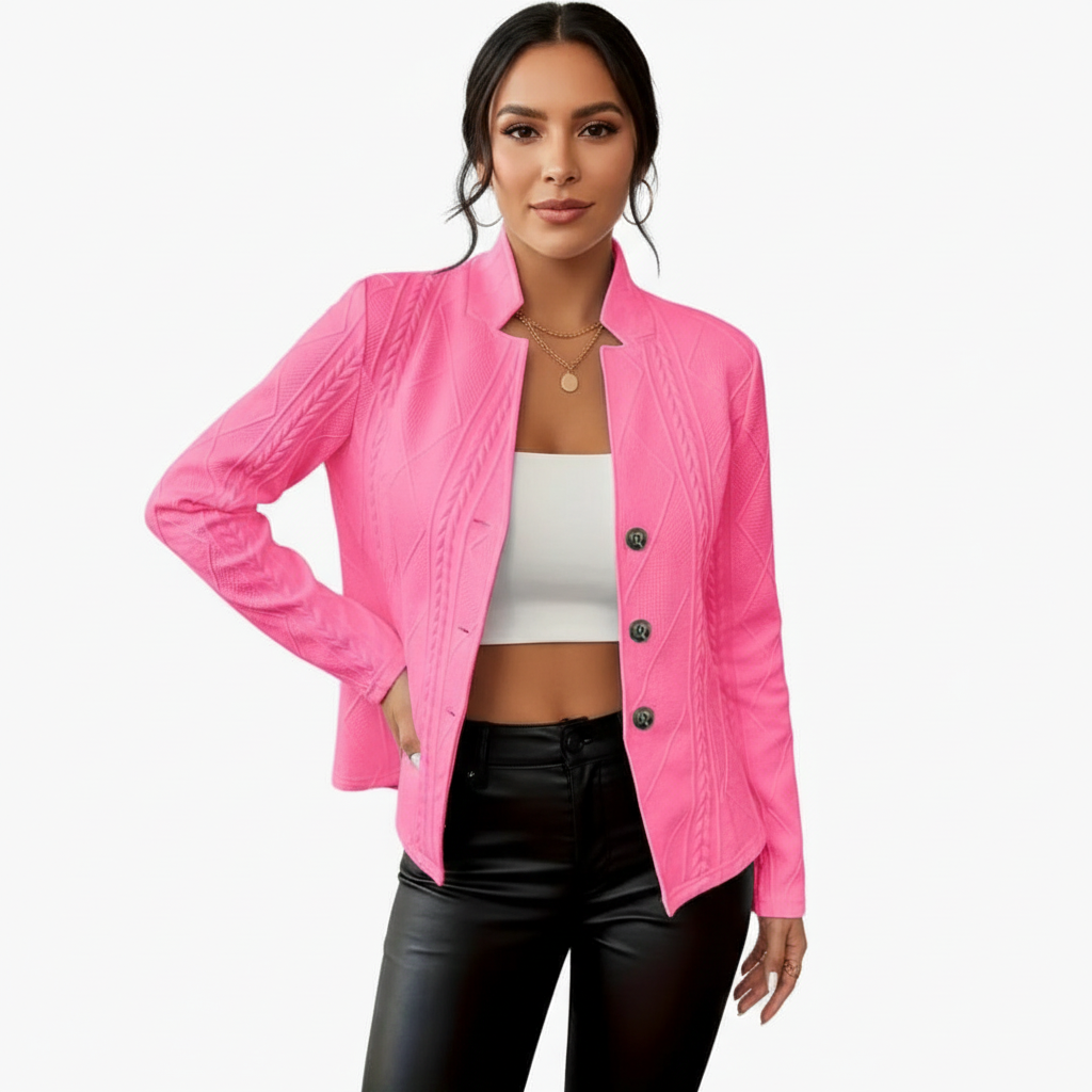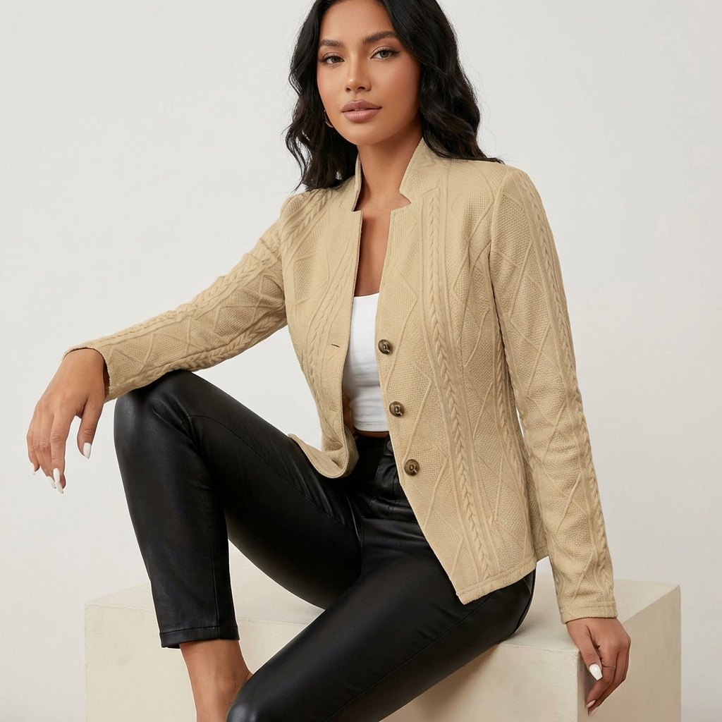 Deze stijlvolle blazer is ontworpen voor vrouwen die willen opvallen met verfijnde details. Het subtiele structuurpatroon geeft het ontwerp een luxe en unieke uitstraling, terwijl de getailleerde pasvorm je silhouet prachtig accentueert. De knoopsluiting en elegante kraag zorgen voor een tijdloze touch, perfect voor zowel zakelijke momenten als een chique avondlook. De stof voelt comfortabel aan en valt soepel, zodat je je zelfverzekerd én stijlvol voelt.