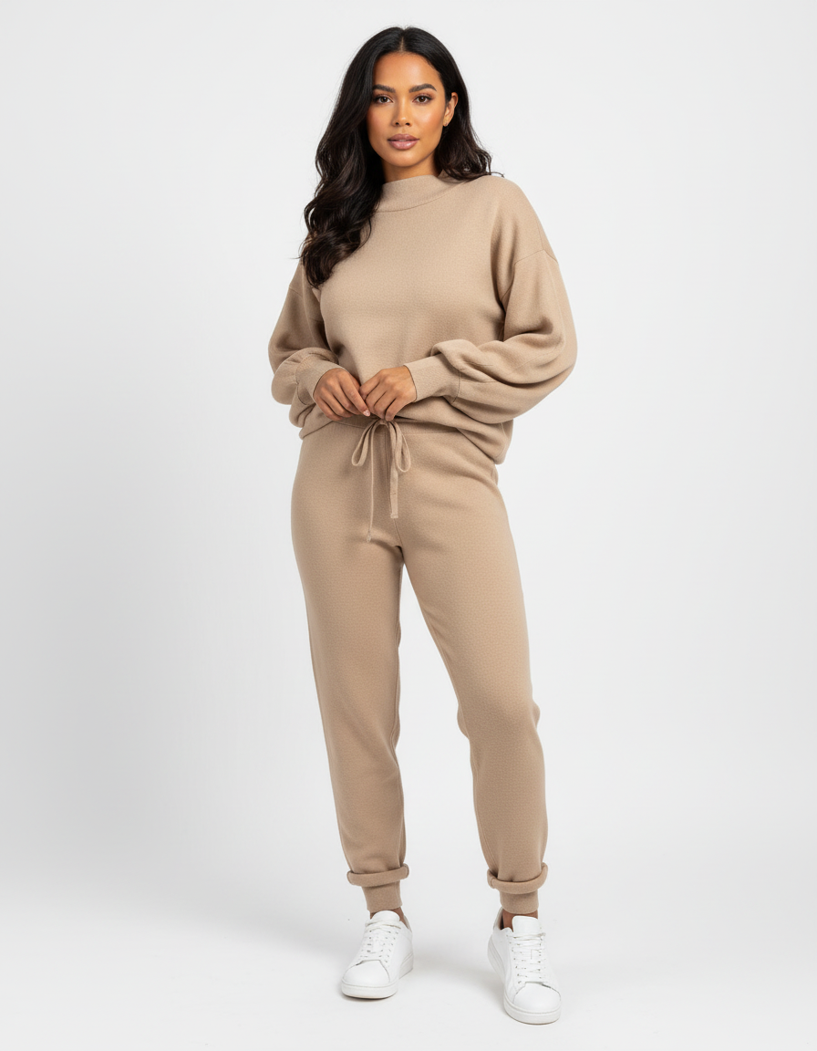 Deze set is ontworpen voor vrouwen die zich ontspannen willen voelen, zonder in te leveren op uitstraling. De zachte, gebreide stof voelt heerlijk aan op de huid en valt soepel om het lichaam. De relaxte top en bijpassende broek creëren samen een verfijnd silhouet dat zowel geschikt is voor thuis als voor casual momenten buitenshuis. Dit ontwerp straalt rust, luxe en moeiteloze stijl uit.