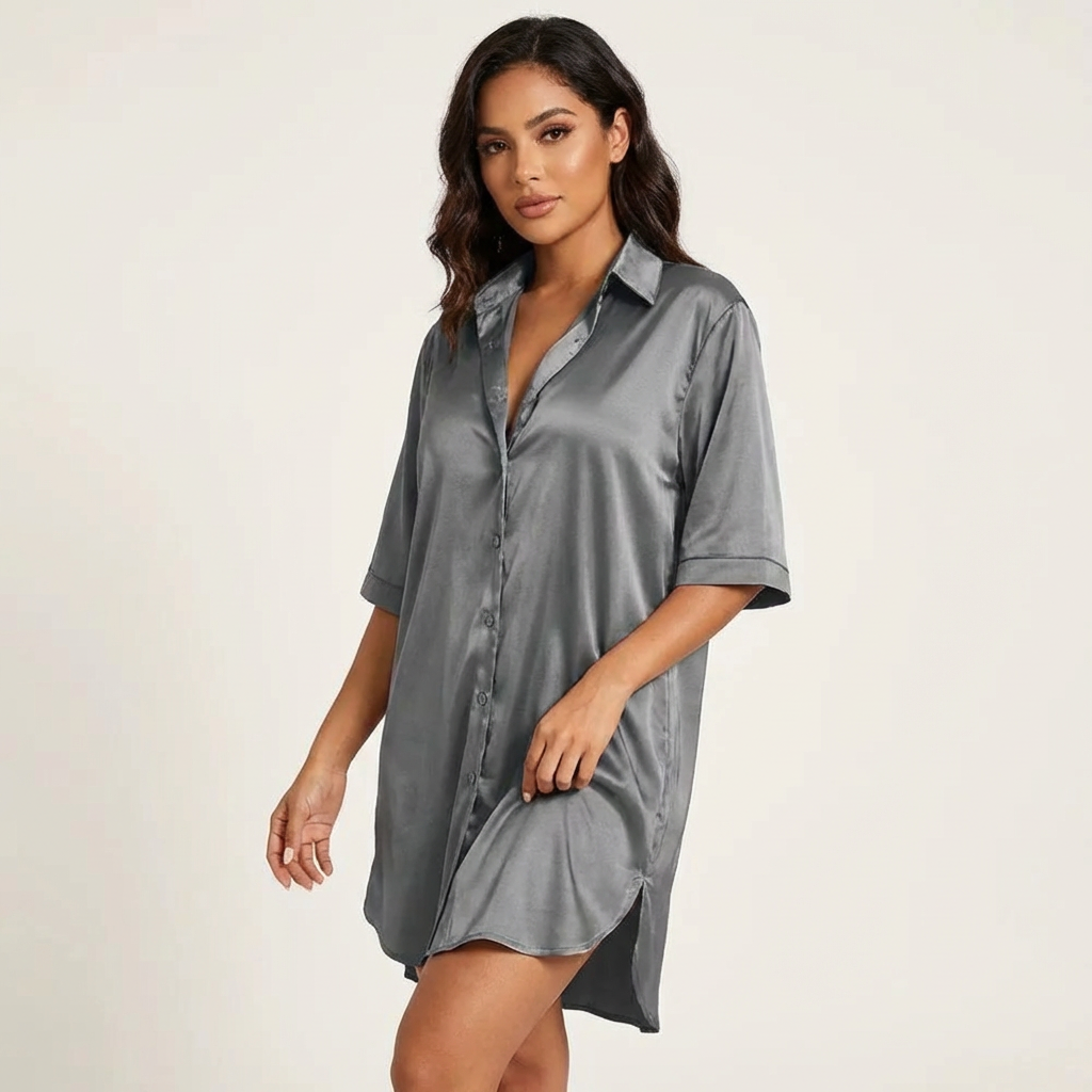 Een must-have voor warme nachten die comfort en stijl naadloos combineren. Het luchtige satin voelt zacht tegen de huid en beweegt mee, terwijl de flatterende pasvorm een verzorgde, vrouwelijke look geeft. Dankzij de omvouwkraag en subtiele knoopdetails oogt het tijdloos en elegant.