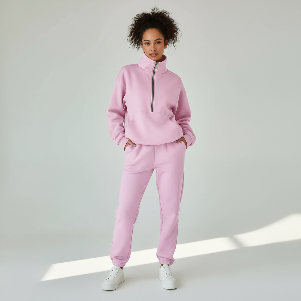 Deze tweedelige set is ontworpen voor ultiem comfort met een stijlvolle, moderne look. De top met half-zip en opstaande kraag valt normaal op de taille en zorgt voor een sportieve maar verfijnde uitstraling. De bijpassende broek met elastische tailleband heeft een ontspannen pasvorm en draagt heerlijk de hele dag door. Perfect voor casual dagen, reizen, loungen of een effortless streetwear look.