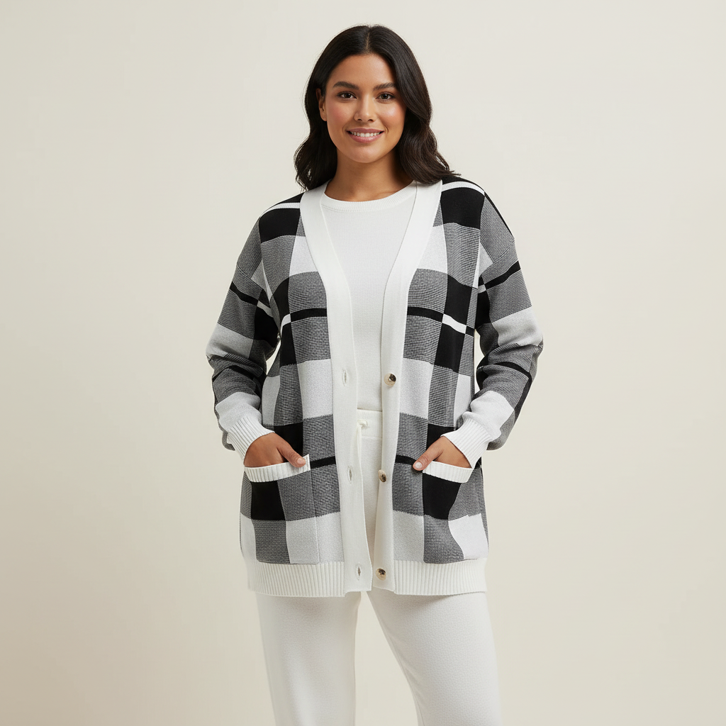 Deze drie-delige set combineert moeiteloze stijl met comfort dat de hele dag meeneemt. De zachte, ademende gebreide stof voelt luxueus aan en flatteert dankzij een ontspannen pasvorm. Het tijdloze plaidpatroon geeft een moderne twist die makkelijk te combineren is met andere items voor lounge, boodschappen of een koffiedate.