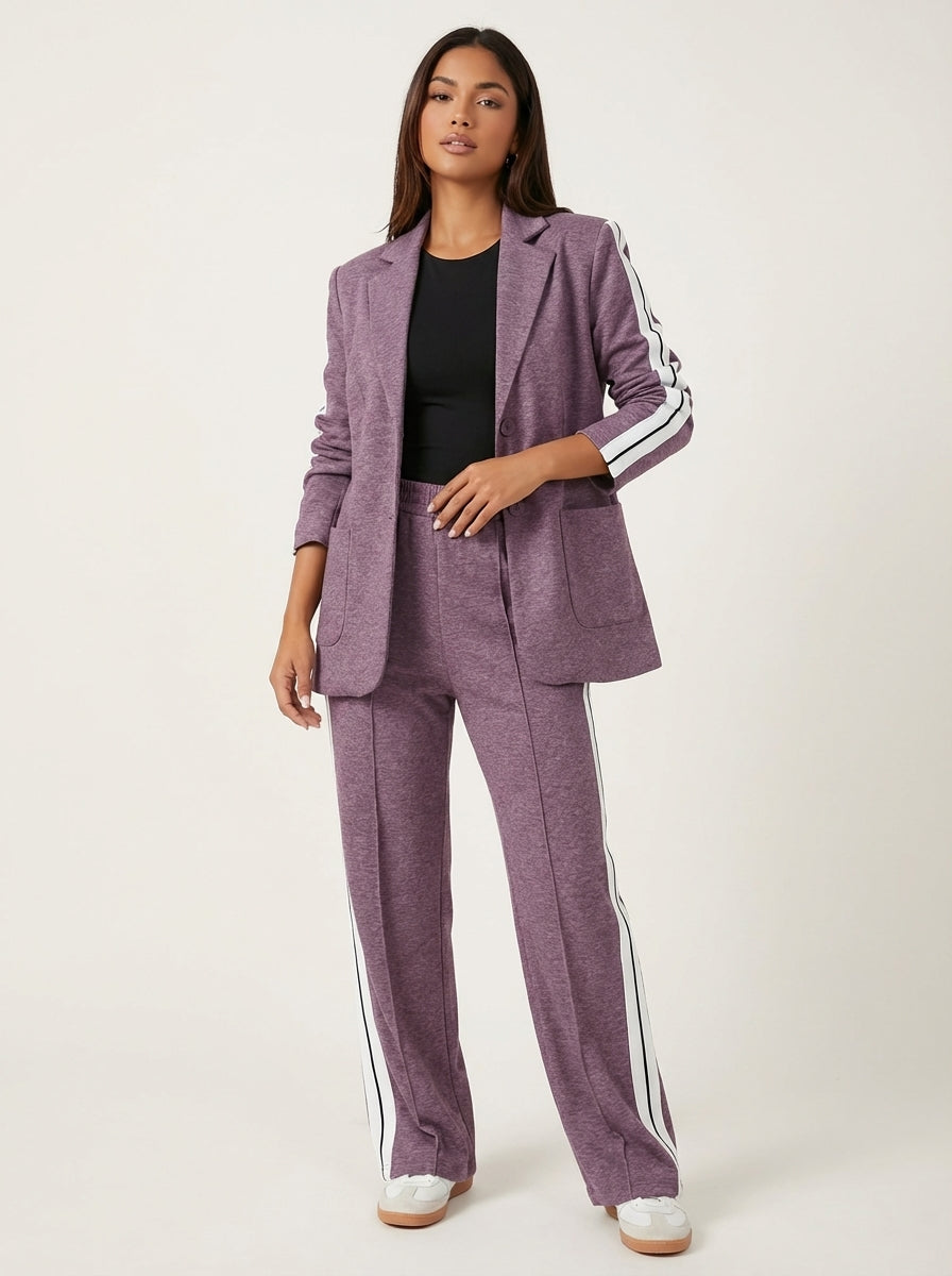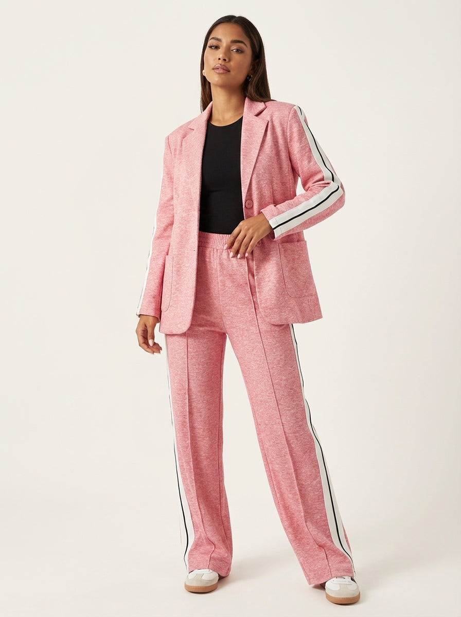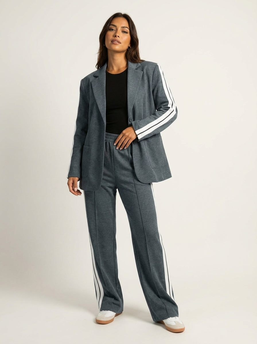 Deze set is ontworpen voor vrouwen die houden van een krachtige uitstraling met een moderne twist. De blazer creëert direct een verzorgde, vrouwelijke look, terwijl de bijpassende broek met contrasterende zijstrepen het geheel een eigentijds en licht sportief karakter geeft. Een perfecte keuze voor dagen waarop je stijlvol voor de dag wilt komen zonder moeite of concessies.