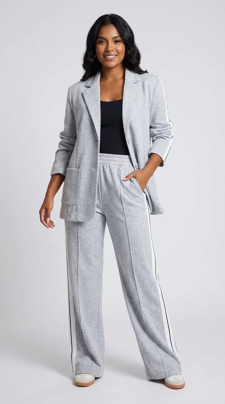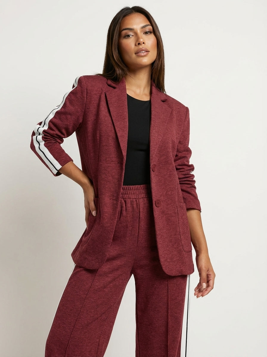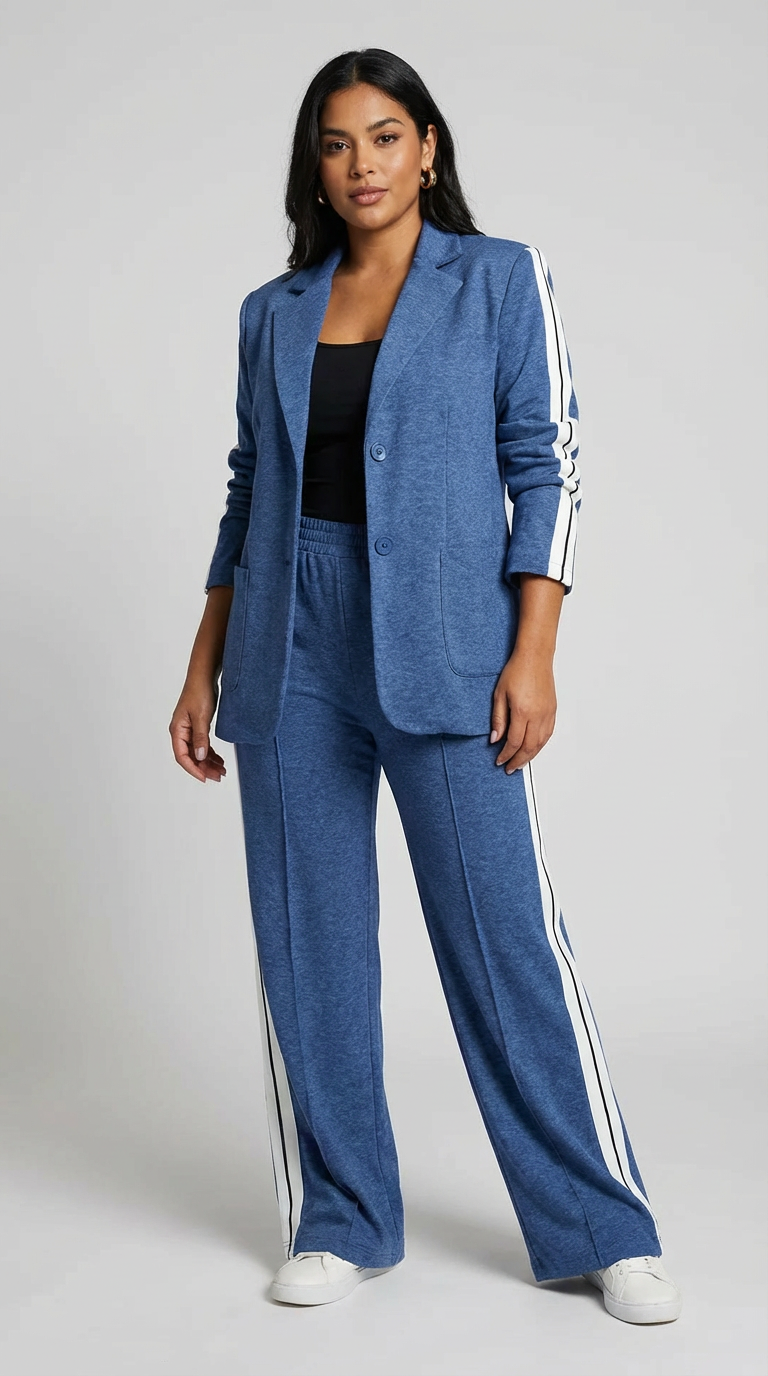 Deze set is ontworpen voor vrouwen die houden van een krachtige uitstraling met een moderne twist. De blazer creëert direct een verzorgde, vrouwelijke look, terwijl de bijpassende broek met contrasterende zijstrepen het geheel een eigentijds en licht sportief karakter geeft. Een perfecte keuze voor dagen waarop je stijlvol voor de dag wilt komen zonder moeite of concessies.