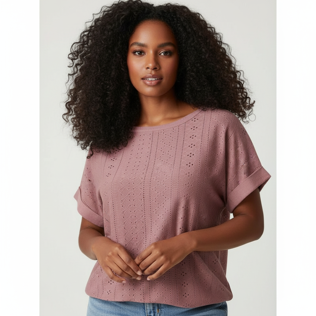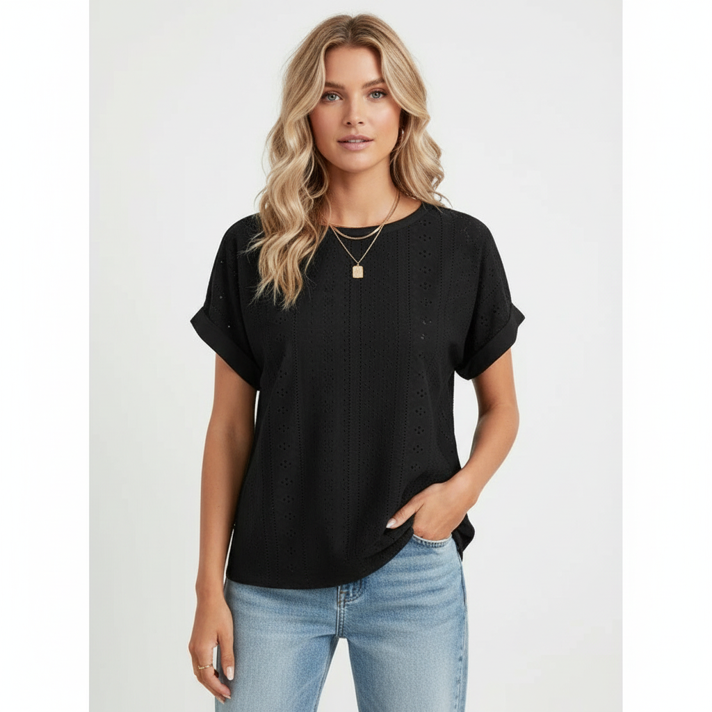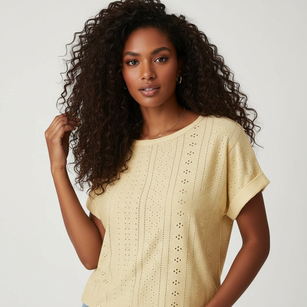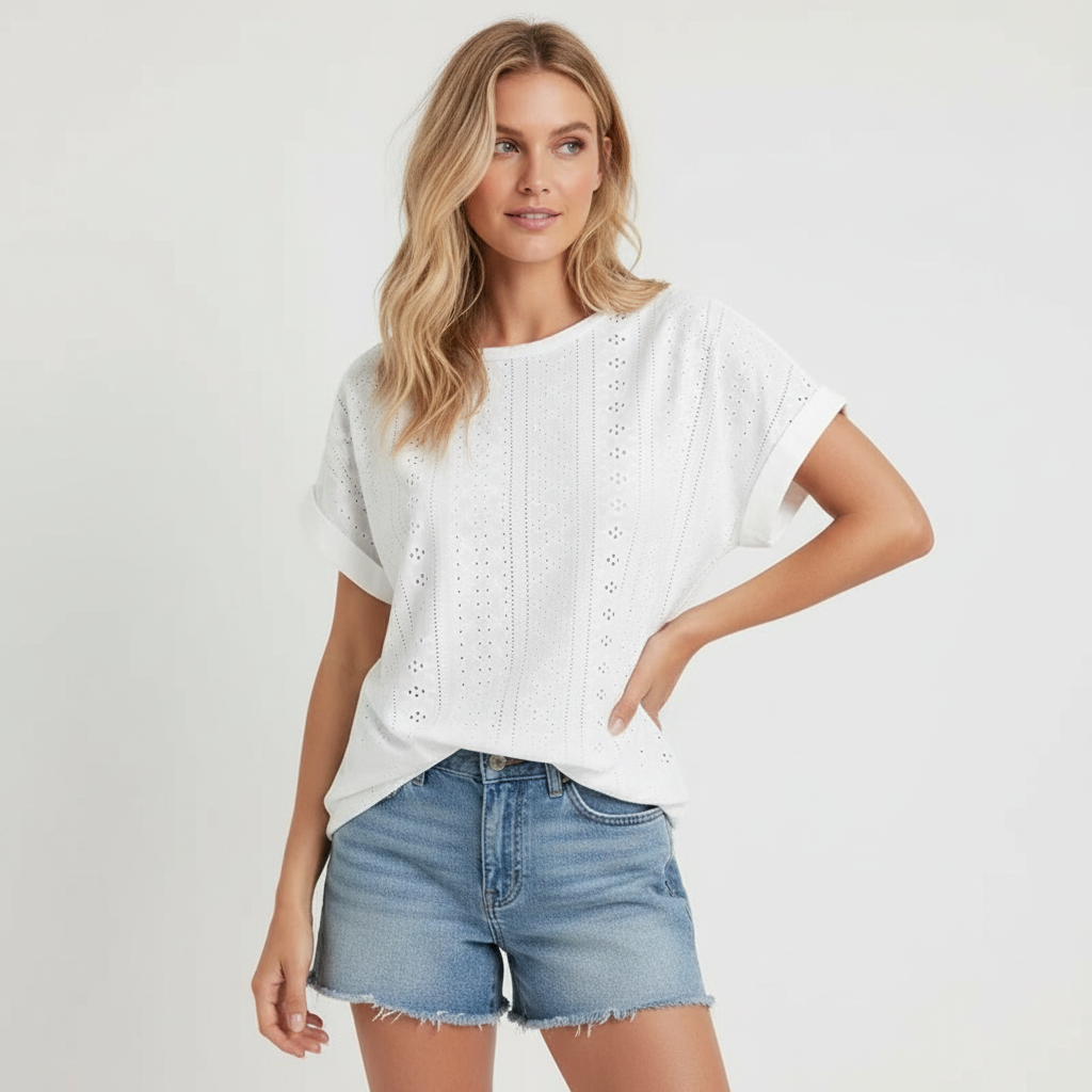 Deze top combineert comfort met subtiele elegantie dankzij het verfijnde broderiepatroon en de zachte, ademende stof. De licht opgerolde mouwen en ronde halslijn geven dit ontwerp een ontspannen maar verzorgde uitstraling. Perfect te dragen op een denim short, jeans of rok voor een moeiteloos vrouwelijke look.