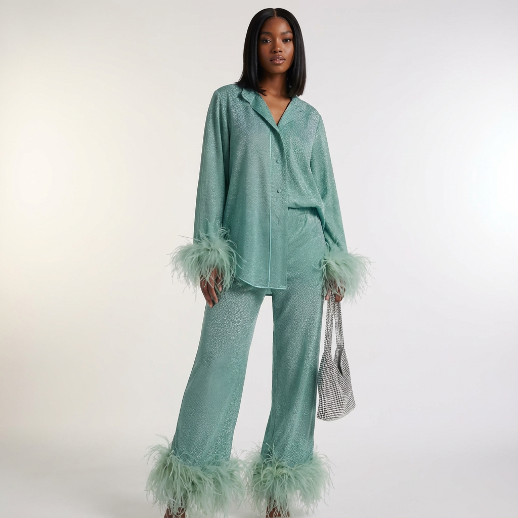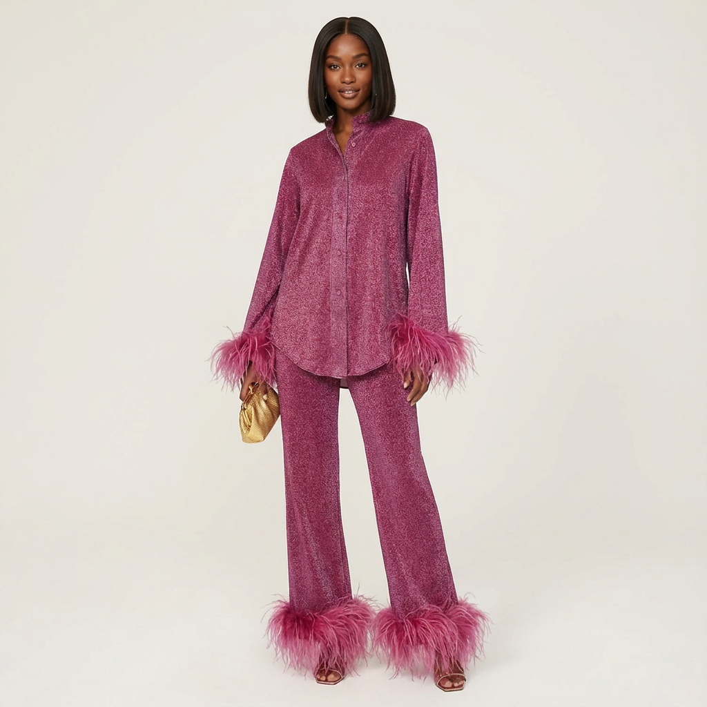 Deze tweedelige set is ontworpen voor vrouwen die houden van uitgesproken stijl met een elegante basis. Het overhemd met knoopsluiting en puntige kraag valt soepel langs het lichaam, terwijl de rechte broek zorgt voor een uitgebalanceerd silhouet. De subtiele verenafwerking aan manchetten en zoom geeft de set een verfijnde, modieuze uitstraling die direct opvalt zonder te overheersen.