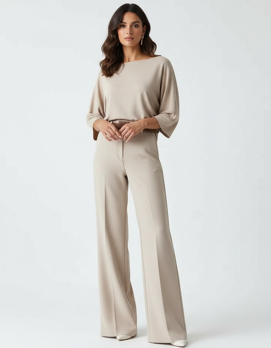 Deze set is ontworpen voor vrouwen die houden van ingetogen luxe en een krachtige, vrouwelijke uitstraling. De soepelvallende top met wijde mouwen creëert een elegante balans met de lange, vloeiende pantalon. De zachte stof beweegt mooi met je mee en geeft het geheel een verzorgde, tijdloze look die geschikt is voor zowel formele als stijlvolle dagelijkse momenten.