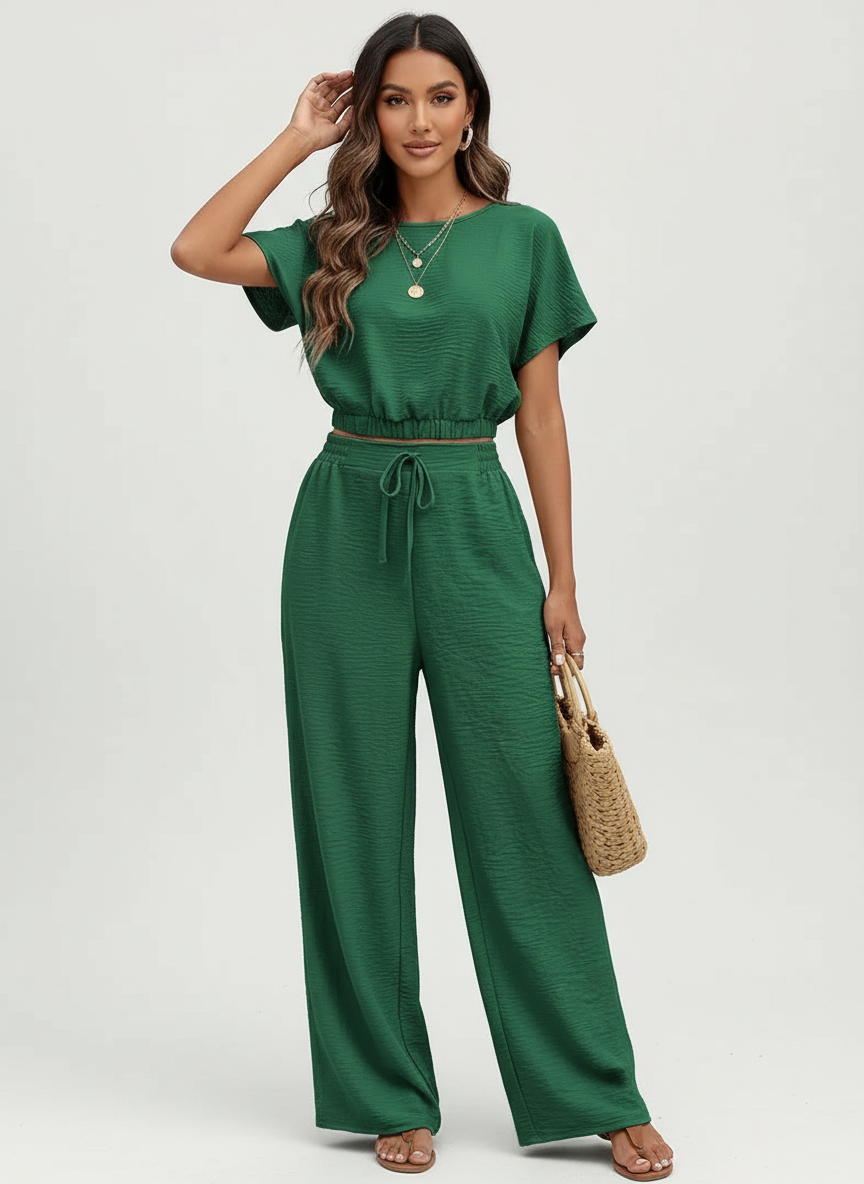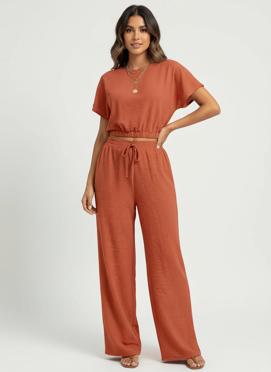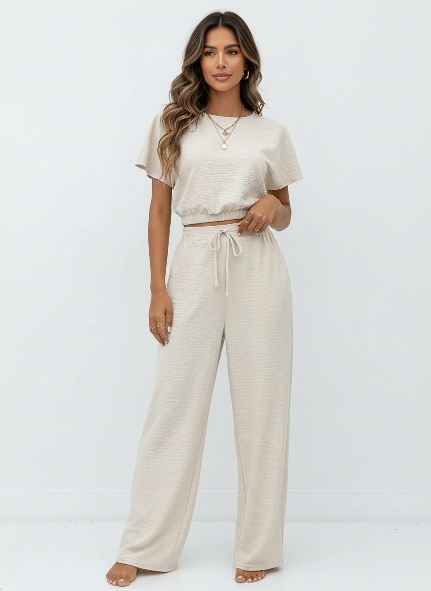 Deze tweedelige set is ontworpen voor vrouwen die houden van een verzorgde, rustige look zonder in te leveren op comfort. De soepel vallende stof voelt licht aan op de huid en beweegt elegant met je mee, terwijl de relaxte pasvorm zorgt voor een zelfverzekerde uitstraling. Ideaal voor stijlvolle dagen thuis, onderweg of casual momenten waarbij comfort en klasse samenkomen.