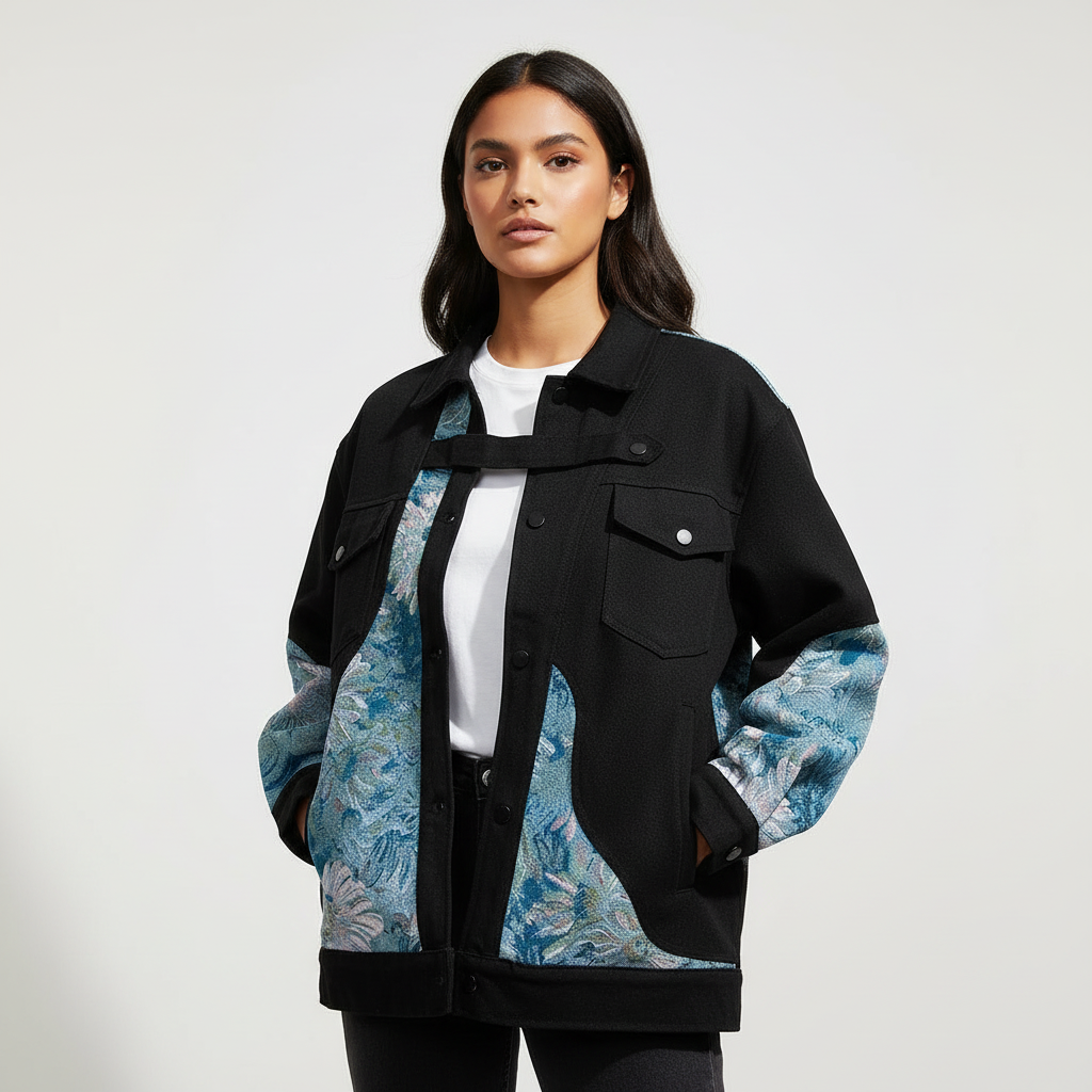 Dit unieke denim jacket valt direct op door de contrasterende bloemenpanelen met een verfijnde, bijna schilderachtige uitstraling. De klassieke kraag en drukknoopsluiting geven het ontwerp een stoere basis, terwijl de rijke structuur en het patroon zorgen voor een creatieve, moderne twist. Een echte eyecatcher voor wie durft op te vallen.