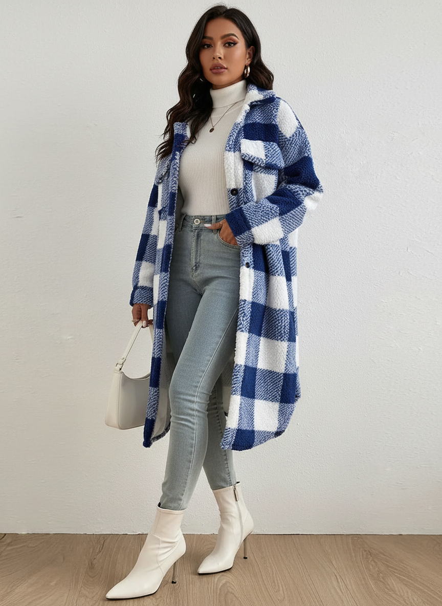 Deze lange plaid jas van zacht faux shearling omarmt je met knusse warmte en een luxe, moeiteloze stijl. De pasvorm is relaxter en tegelijkertijd flatterend dankzij de lange lijn en het hoge kraagontwerp. Draag 'm over een outfit en je straalt direct.