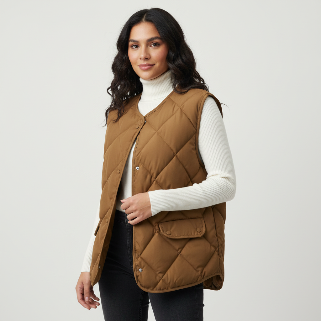 ✓ Diamantgestikt patroon: geeft structuur en een verfijnde afwerking zonder te overheersen. ✓ Lichte vulling: biedt aangename warmte en blijft comfortabel gedurende de dag. ✓ Kraagloos ontwerp: laat zich gemakkelijk combineren met coltruien en blouses. ✓ Praktische zakken met klep: subtiel verwerkt en functioneel in dagelijks gebruik.
