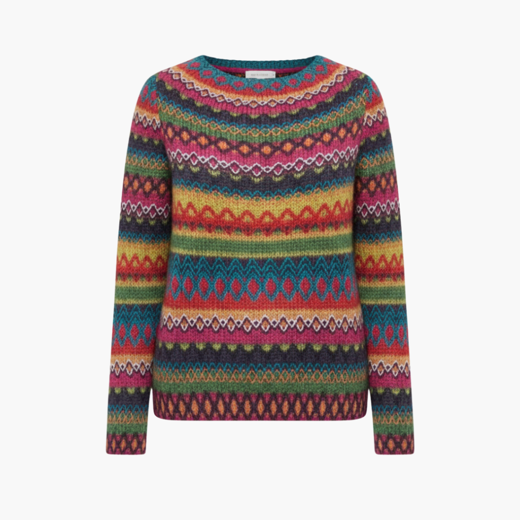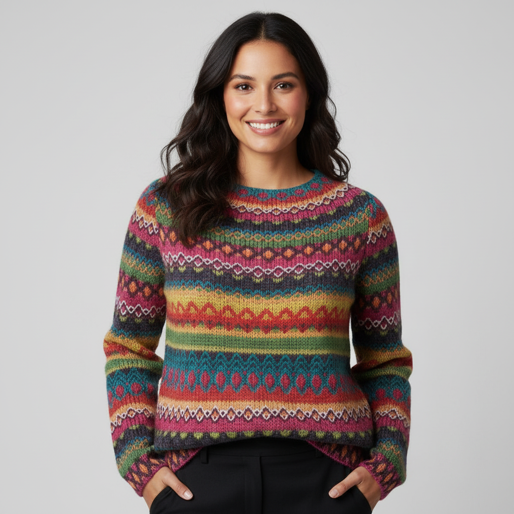 Deze gebreide trui valt op door het rijke, meerkleurige patroon en de klassieke ronde hals. Het ontwerp voelt warm en comfortabel aan, terwijl de rechte snit zorgt voor een toegankelijke pasvorm. Ideaal voor frisse dagen, ontspannen momenten of om je dagelijkse look net dat beetje extra karakter te geven.