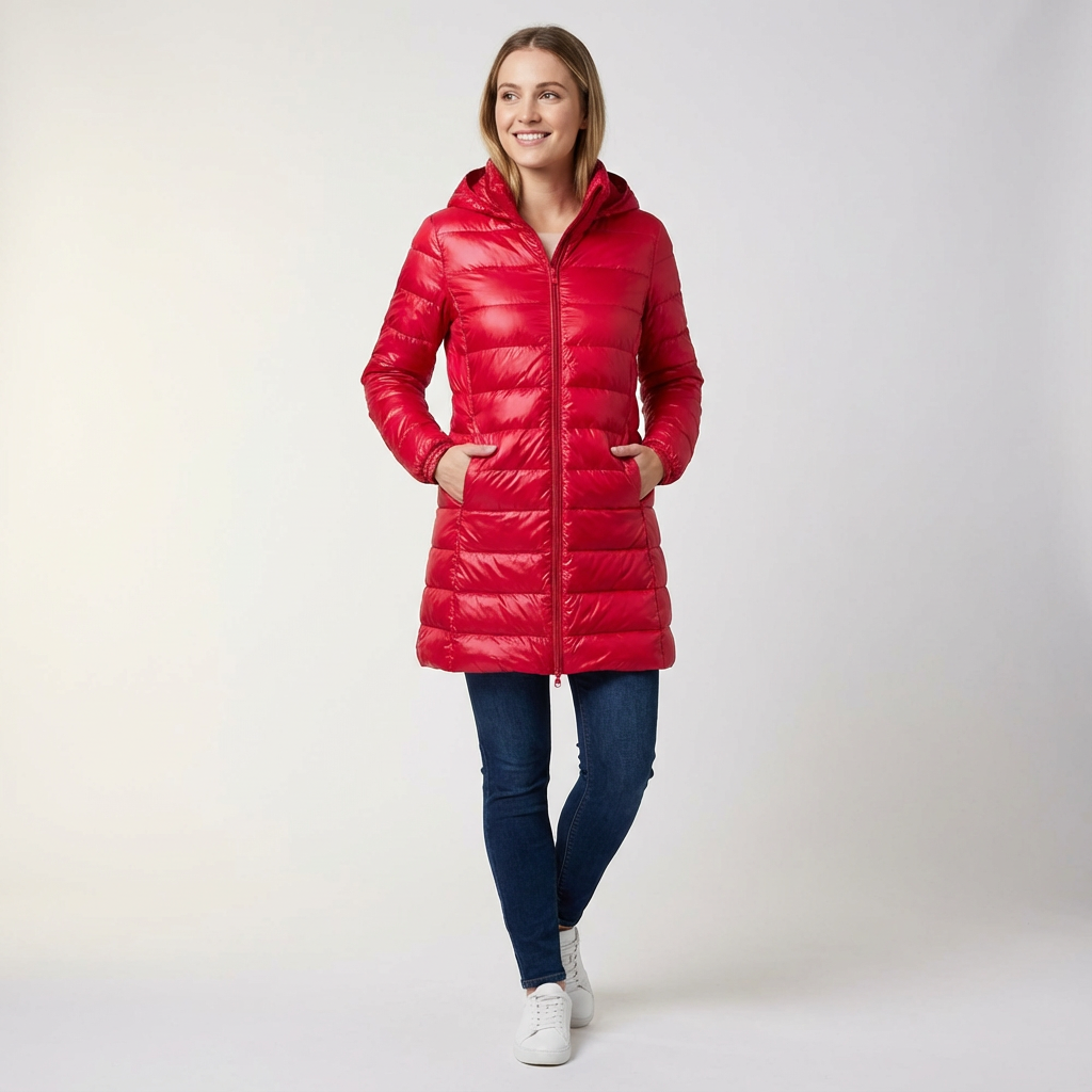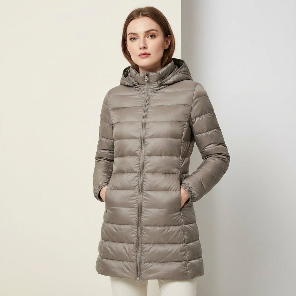Deze lange pufferjas is ontworpen voor koude dagen waarop je warm wilt blijven zonder in te leveren op stijl. De jas heeft een slanke, vrouwelijke uitstraling en voelt licht aan, terwijl de gewatteerde structuur zorgt voor aangename isolatie. Dankzij de vaste capuchon en de praktische lengte is dit een betrouwbare keuze voor dagelijks gebruik, van een wandeling tot onderweg naar werk of boodschappen.