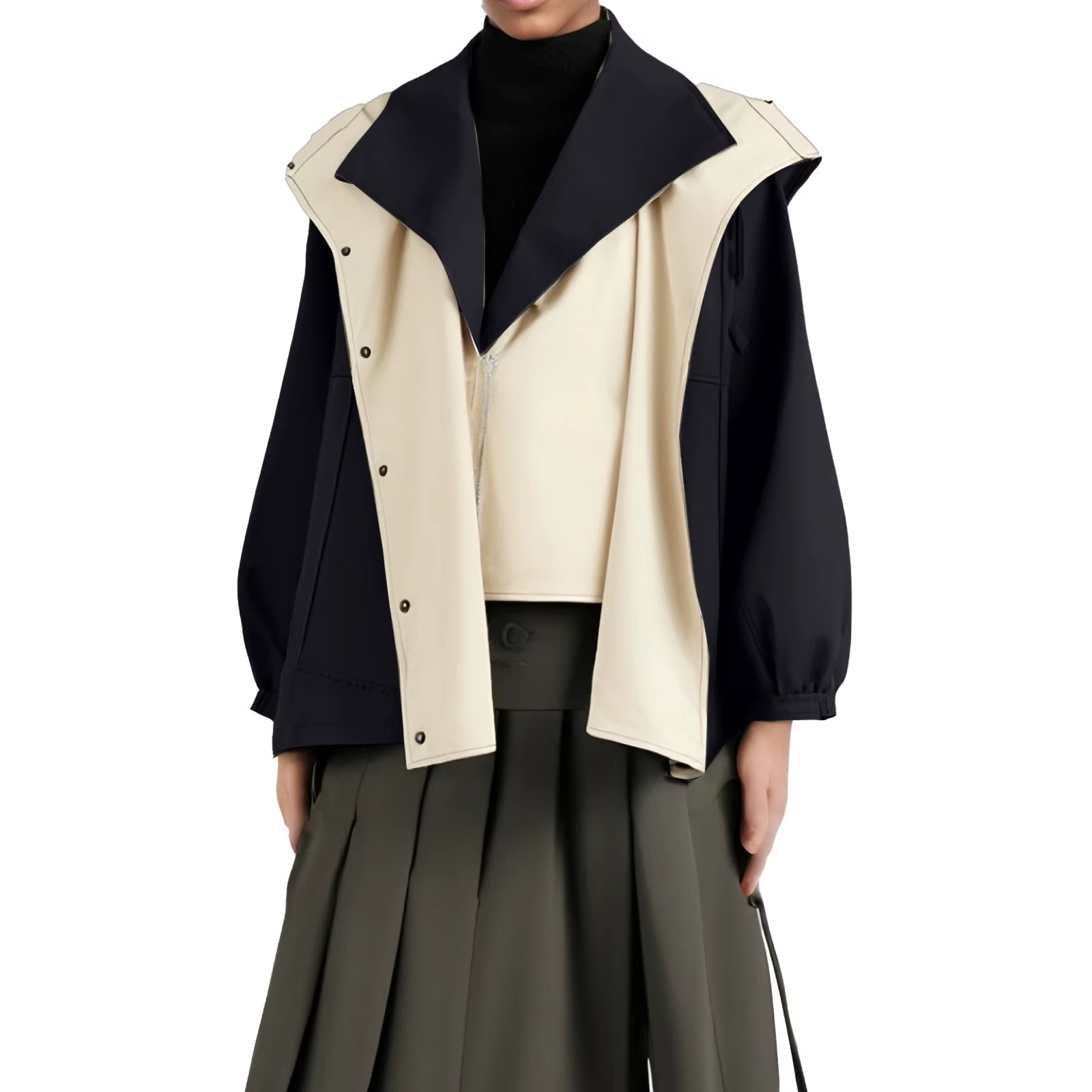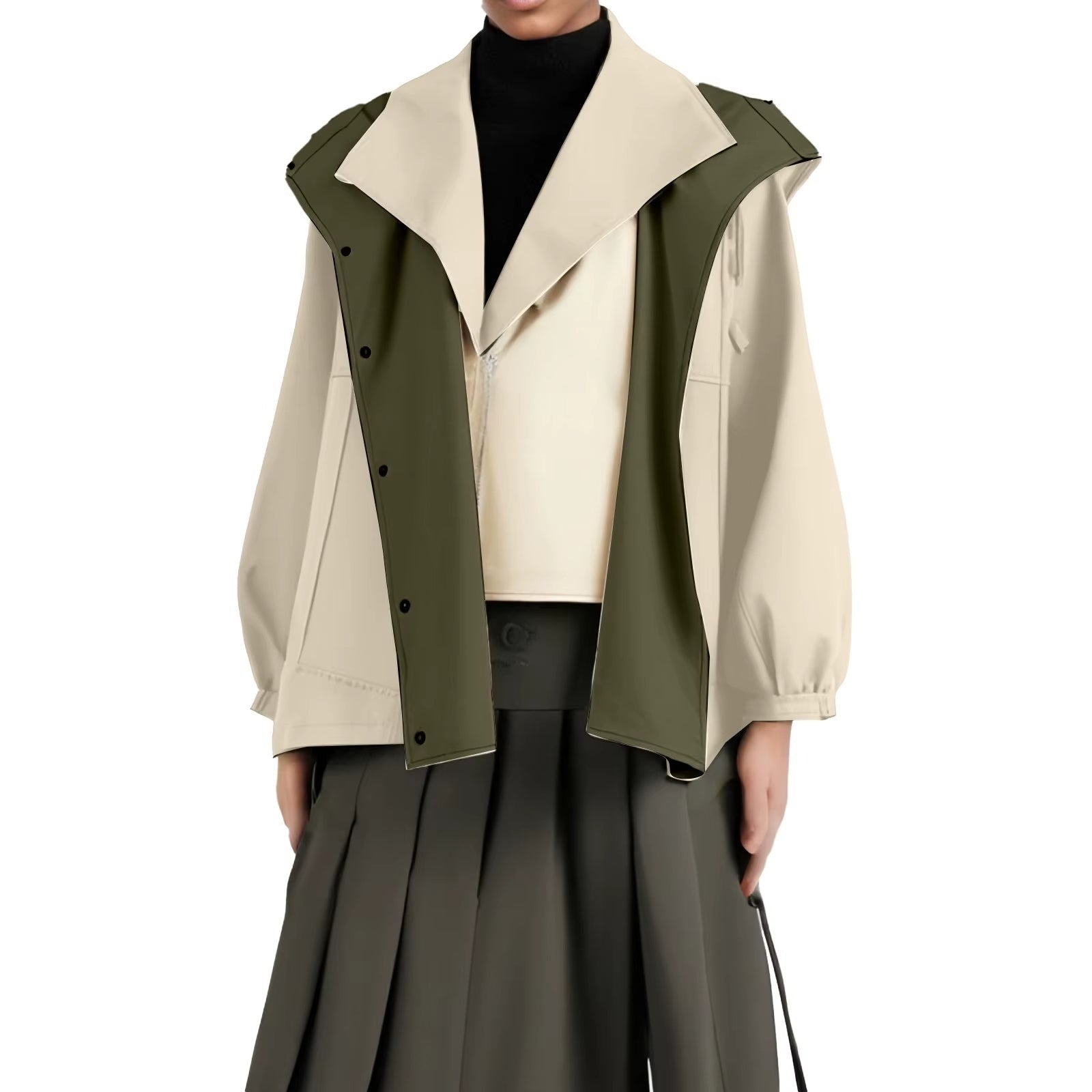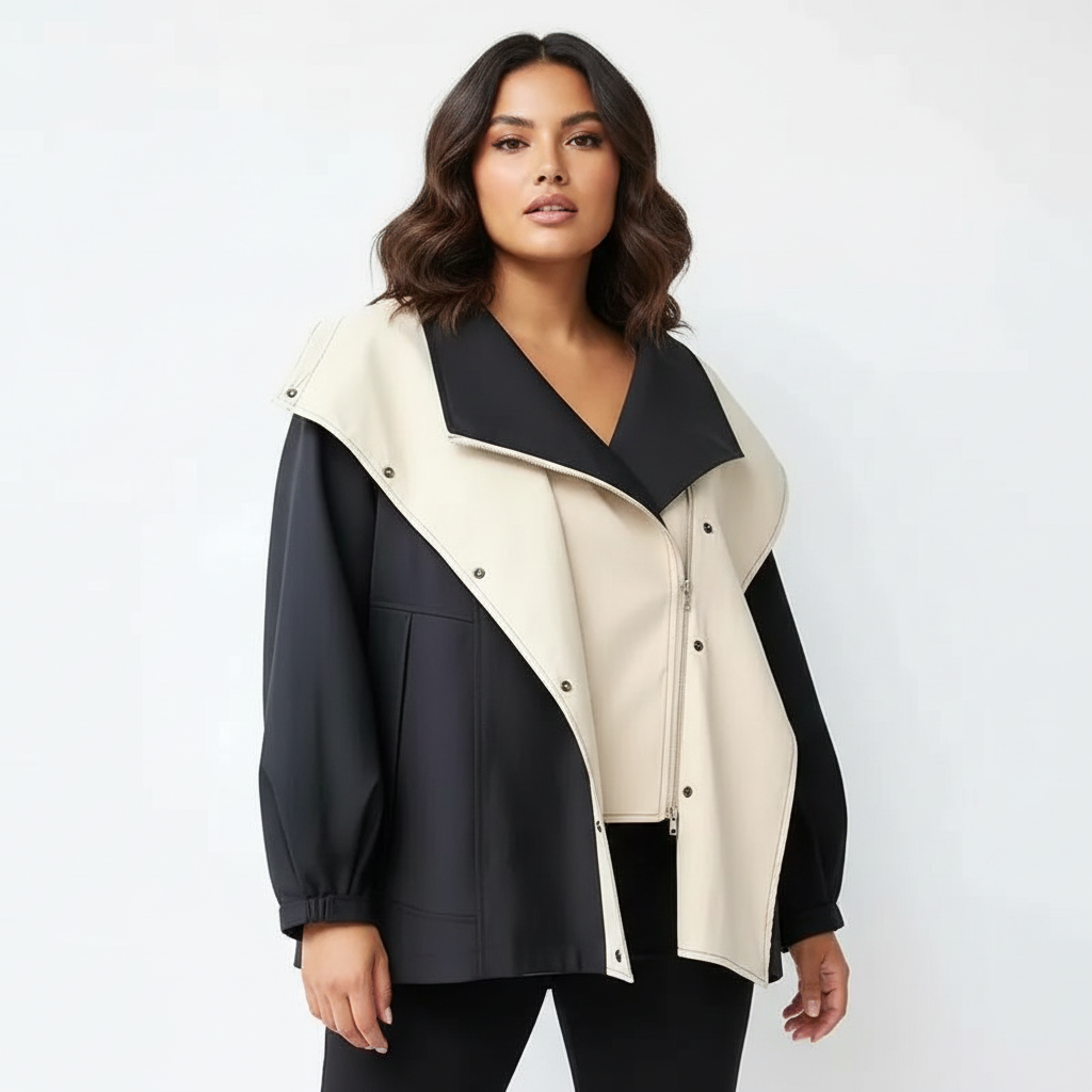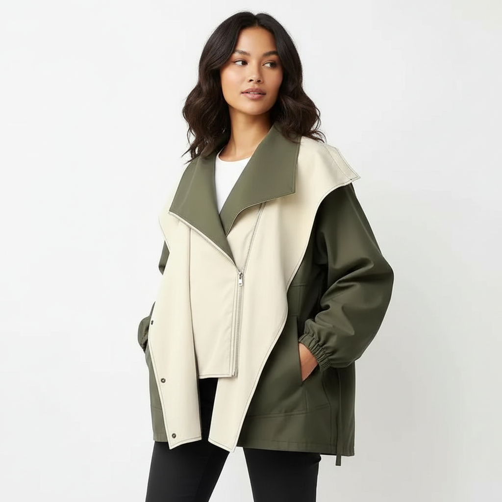 Deze windbreaker is ontworpen voor vrouwen die houden van een krachtige, verfijnde look met een eigentijdse twist. De overslagconstructie en contrasterende panelen geven het ontwerp een luxe uitstraling, terwijl de losse pasvorm zorgt voor comfort en bewegingsvrijheid. Ideaal voor wisselende seizoenen, stadsdagen en momenten waarop stijl en praktisch samenkomen.