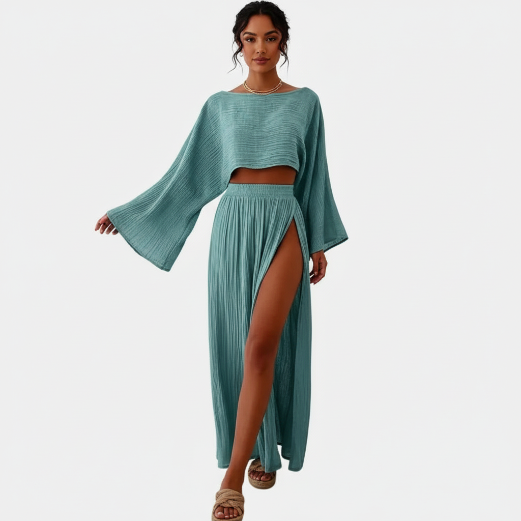 Deze tweedelige set is ontworpen voor vrouwen die moeiteloos willen opvallen. De cropped top met wijde mouwen geeft een moderne, luchtige uitstraling, terwijl de lange rok met hoge split zorgt voor een krachtig en vrouwelijk silhouet. De soepel vallende stof beweegt elegant met je mee en maakt deze set ideaal voor stijlvolle momenten waarin comfort en uitstraling samenkomen.