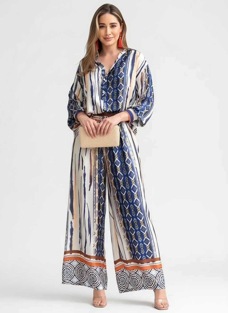 Deze set is ontworpen voor vrouwen die houden van uitstraling zonder moeite. De soepelvallende stof, de rijke print en de flatterende pasvorm zorgen samen voor een zelfverzekerde, vrouwelijke look die zowel ontspannen als verfijnd aanvoelt. Perfect voor momenten waarop je gezien wilt worden, zonder dat het geforceerd voelt.