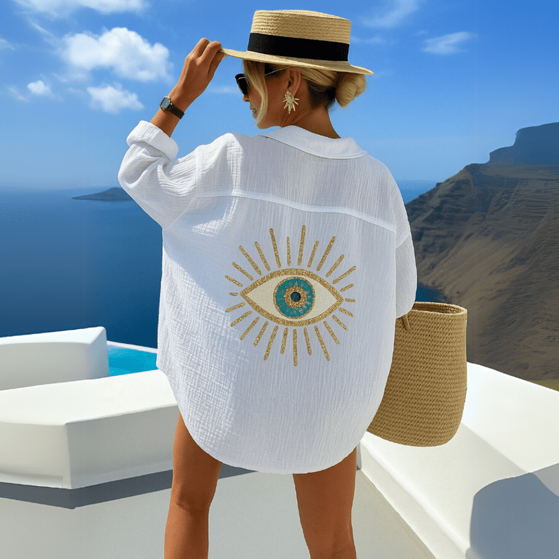 Deze blouse combineert een ontspannen silhouet met een opvallend geborduurd detail op de rug. De losvallende pasvorm en zachte stof zorgen voor een comfortabel gevoel, terwijl het verfijnde oogmotief met subtiele goudaccenten een unieke, luxe touch geeft. Perfect om open te dragen over een top of dichtgeknoopt als statement piece.