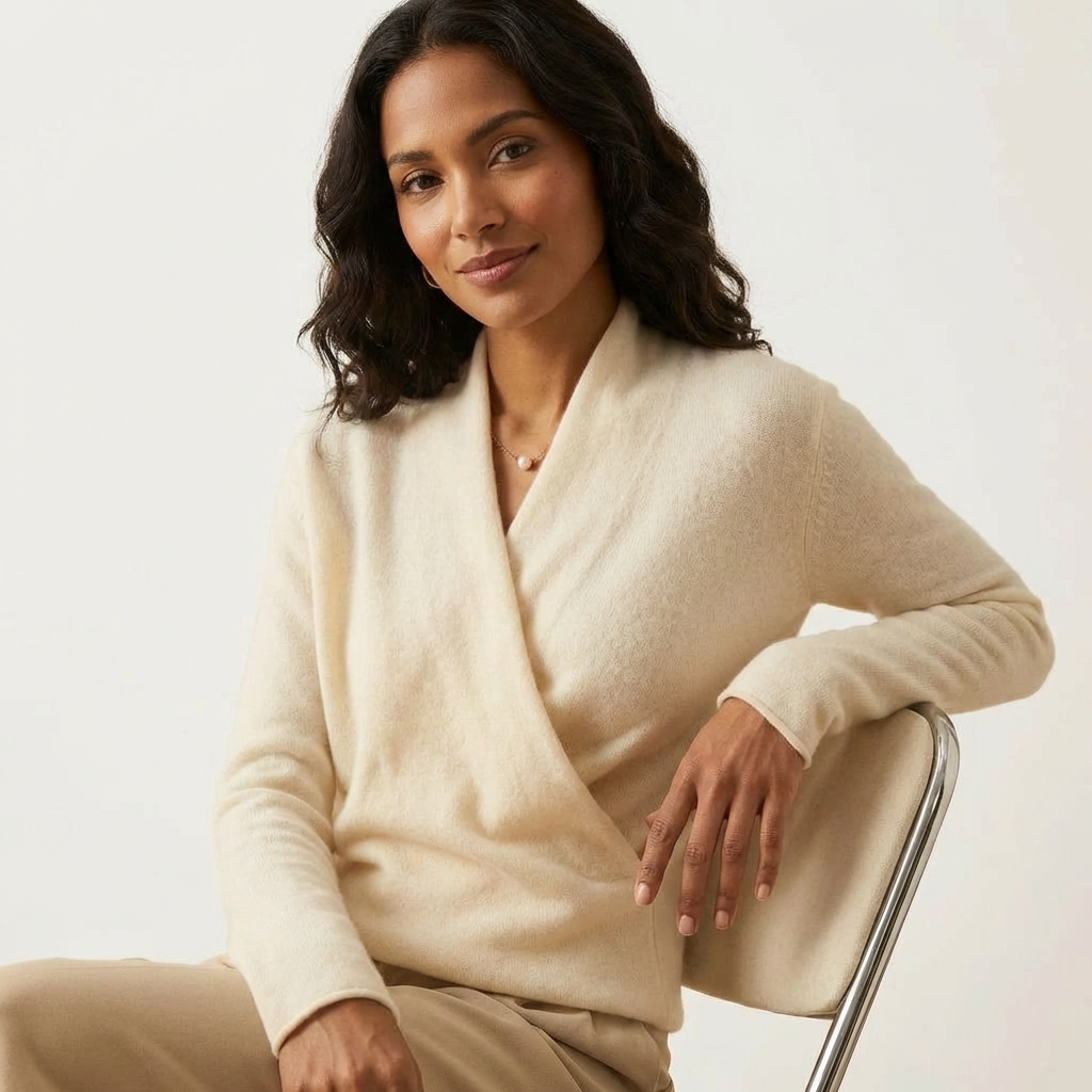 Deze trui straalt pure zachtheid en klasse uit dankzij de verfijnde overslag en subtiele V-hals. De soepel vallende wolblend voelt comfortabel aan op de huid en omhult je met een warme, luxe uitstraling. De flatterende pasvorm benadrukt het silhouet op een vrouwelijke manier en maakt dit ontwerp perfect voor zowel dagelijkse elegantie als stijlvolle momenten.