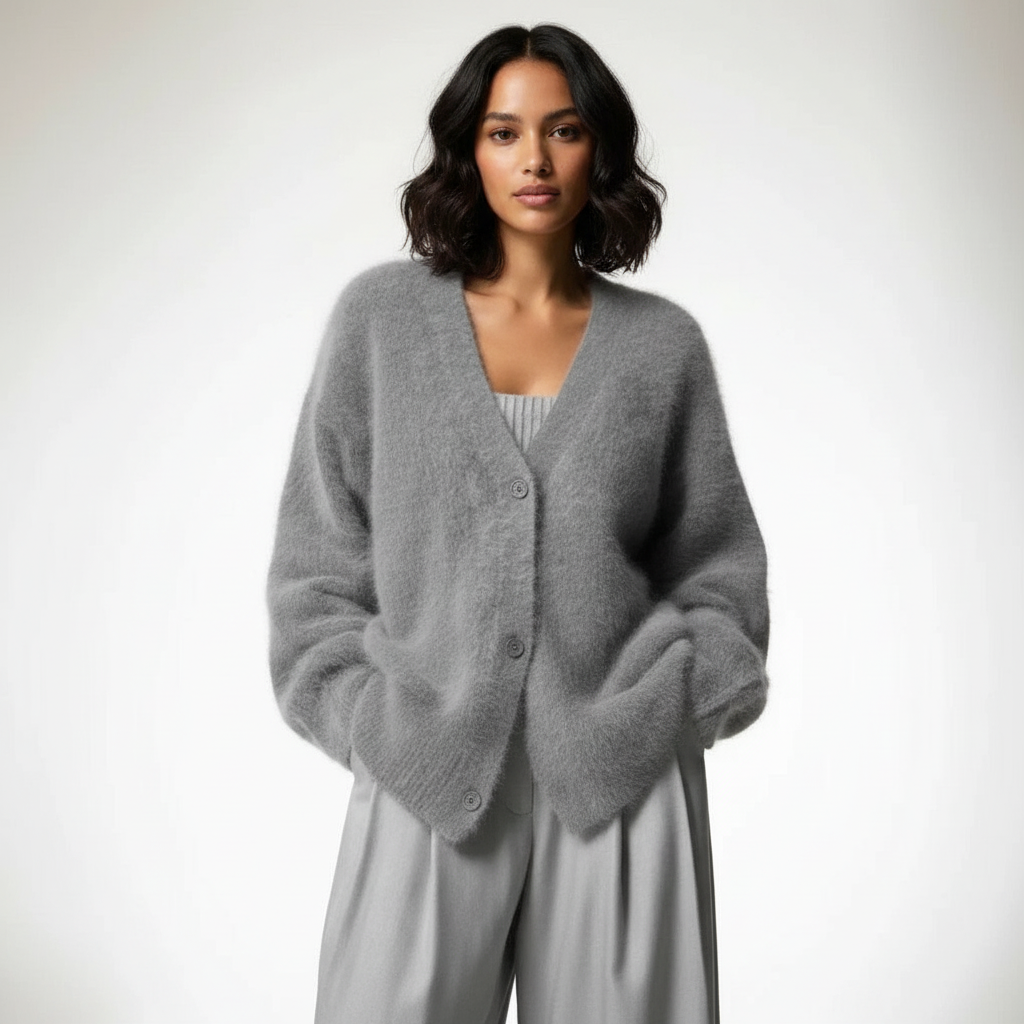 Dit vest straalt pure zachtheid en ingetogen luxe uit. De fluffy gebreide structuur voelt heerlijk licht aan op de huid en valt soepel langs het lichaam voor een vrouwelijke, ontspannen look. De V-hals geeft het ontwerp een subtiele sensualiteit, perfect in balans met de rustige, stijlvolle uitstraling. Ideaal voor momenten waarop comfort en elegantie samenkomen.