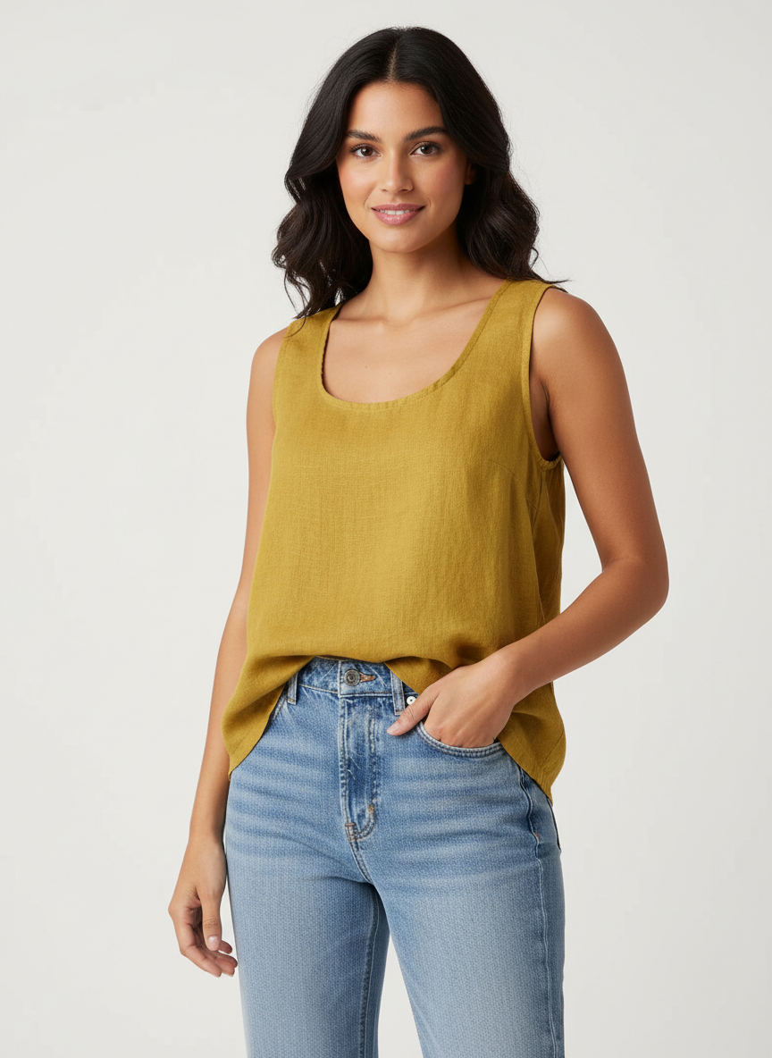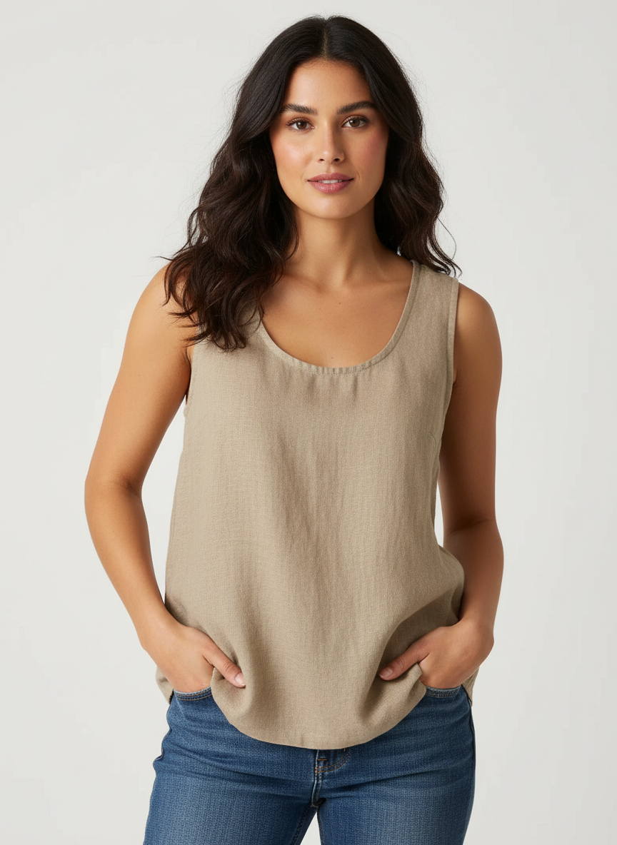 Deze top voelt heerlijk luchtig aan en straalt pure eenvoud uit. De mouwloze snit en ronde halslijn geven een zachte, vrouwelijke uitstraling, terwijl de soepelvallende stof comfortabel langs het lichaam valt. Ideaal voor warme dagen waarop je stijlvol én ontspannen voor de dag wilt komen.