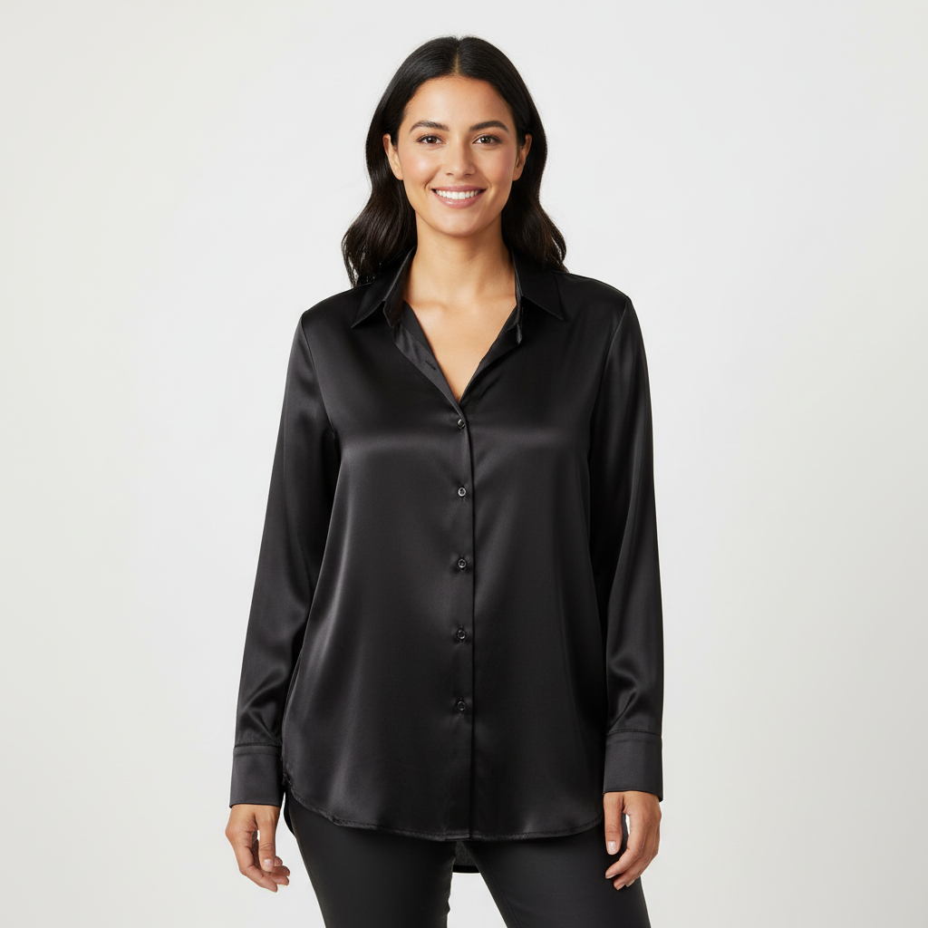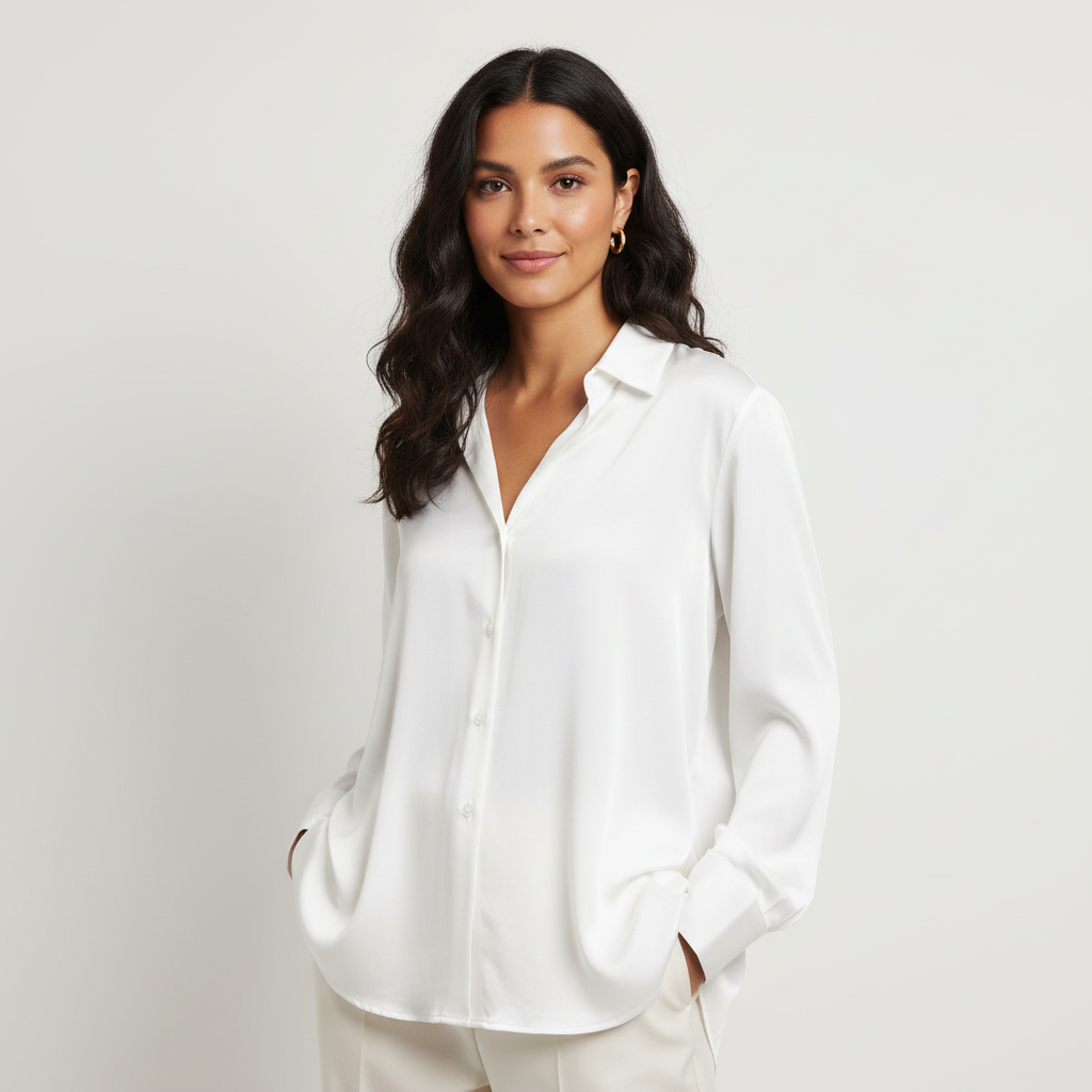 Deze blouse straalt verfijning uit in haar meest pure vorm. De zachte, satijnachtige stof valt soepel langs het lichaam en voelt heerlijk licht aan op de huid. De klassieke kraag en subtiele knoopsluiting geven een tijdloze uitstraling, terwijl de losvallende pasvorm zorgt voor een moeiteloos chic silhouet. Perfect voor kantoor, een diner of een stijlvolle dagelijkse look.
