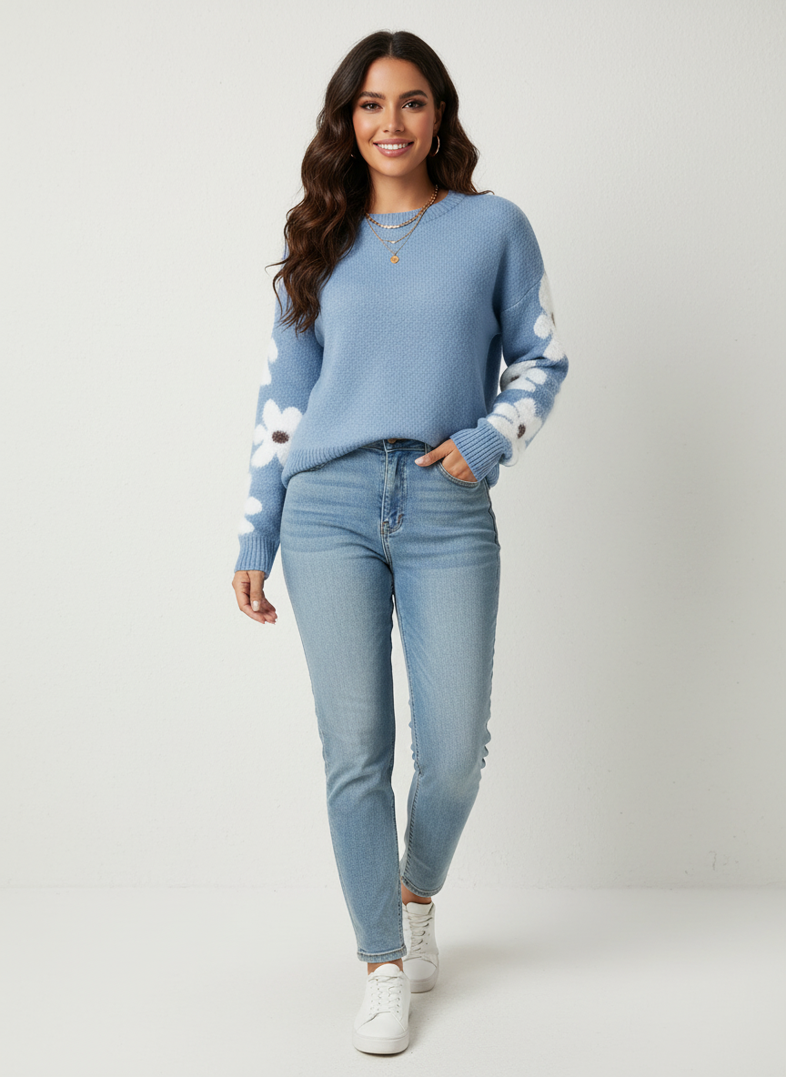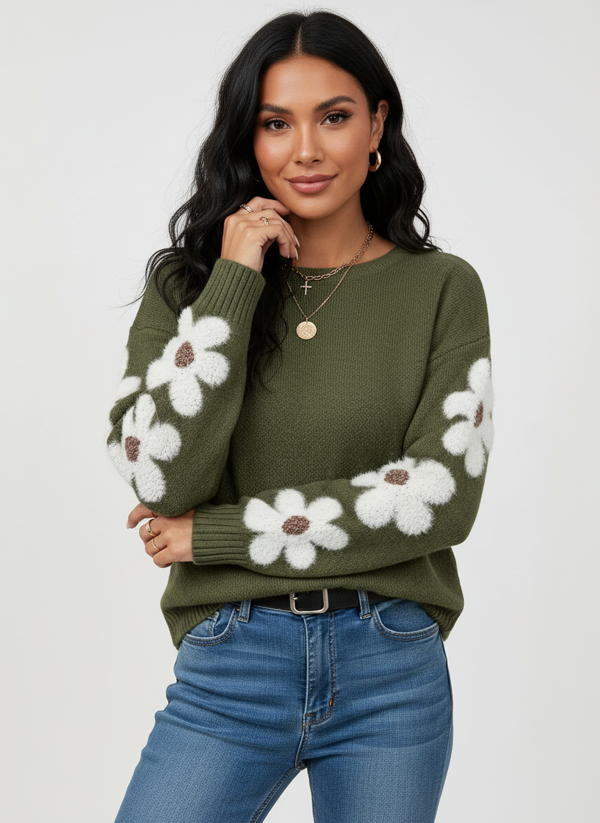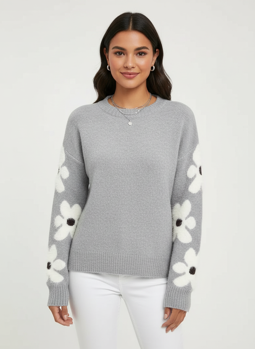 Deze trui is zo’n item dat je meteen wilt aantrekken zodra het wat frisser wordt. De zachte knit voelt comfortabel aan op de huid en valt losjes om het lichaam voor een ontspannen, elegante uitstraling. De subtiele bloemenaccenten op de mouwen geven het geheel een speelse, modieuze twist zonder te overheersen. Perfect voor dagen waarop je er moeiteloos stijlvol uit wilt zien, of je nu onderweg bent of een rustig moment voor jezelf hebt.