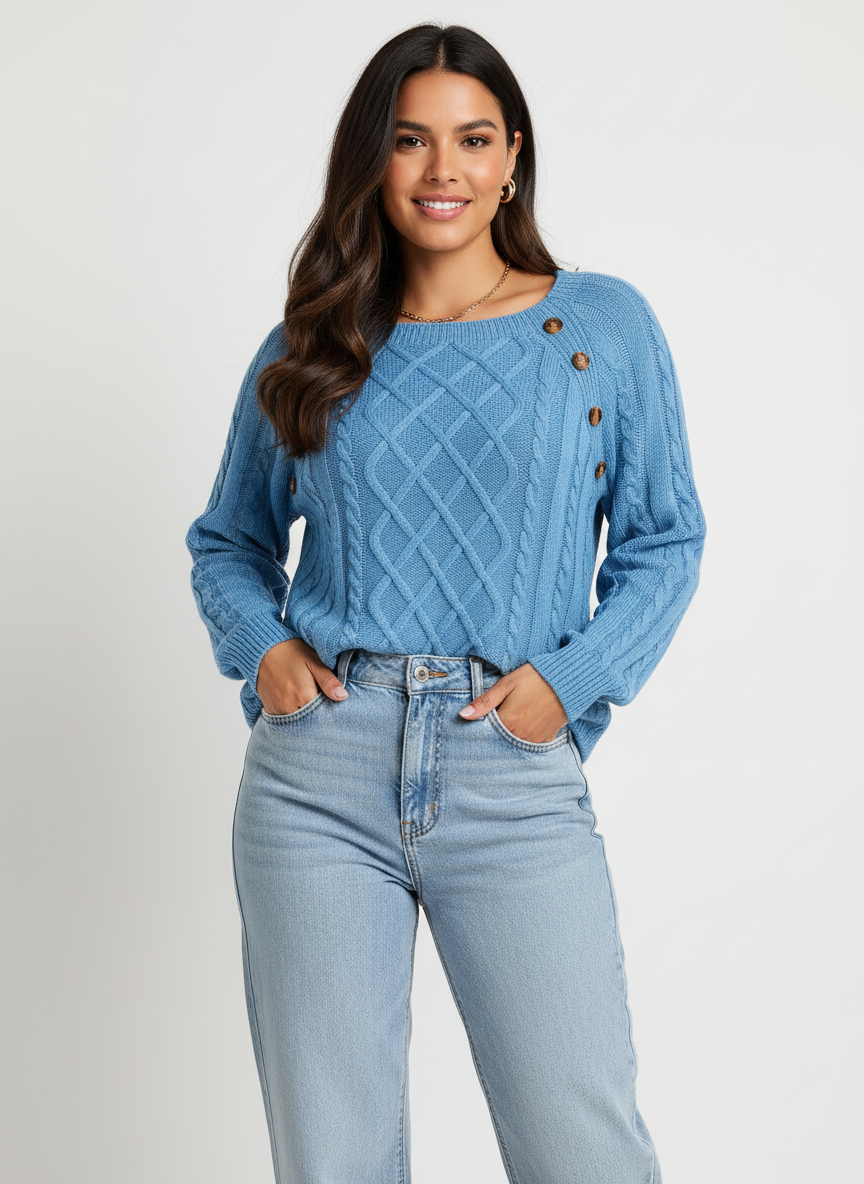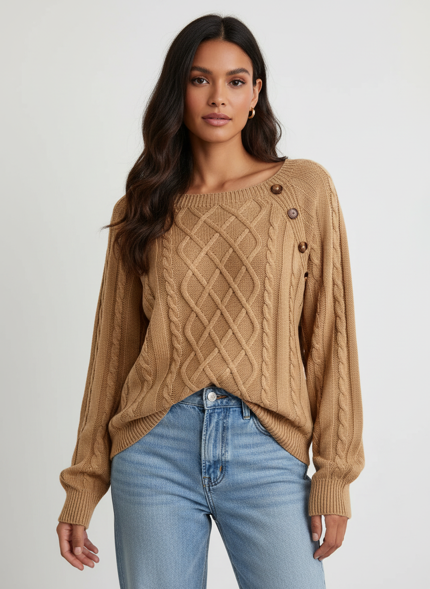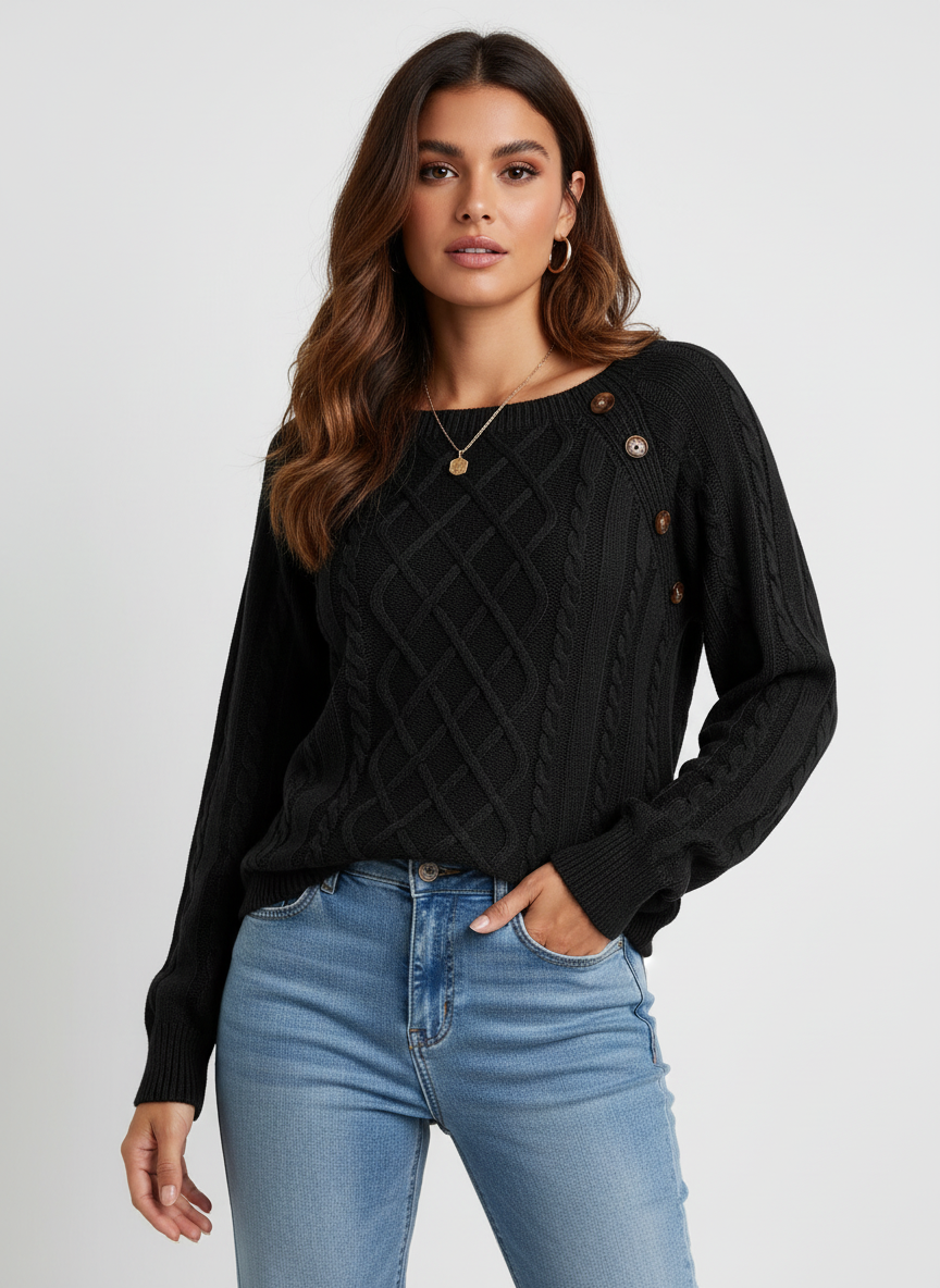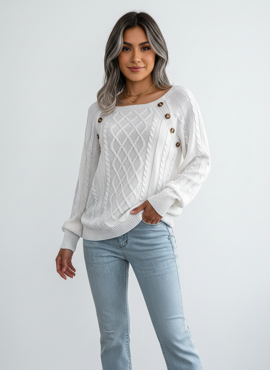 Elegante kabelgebreide damestrui met schouderknopen – Amélie
