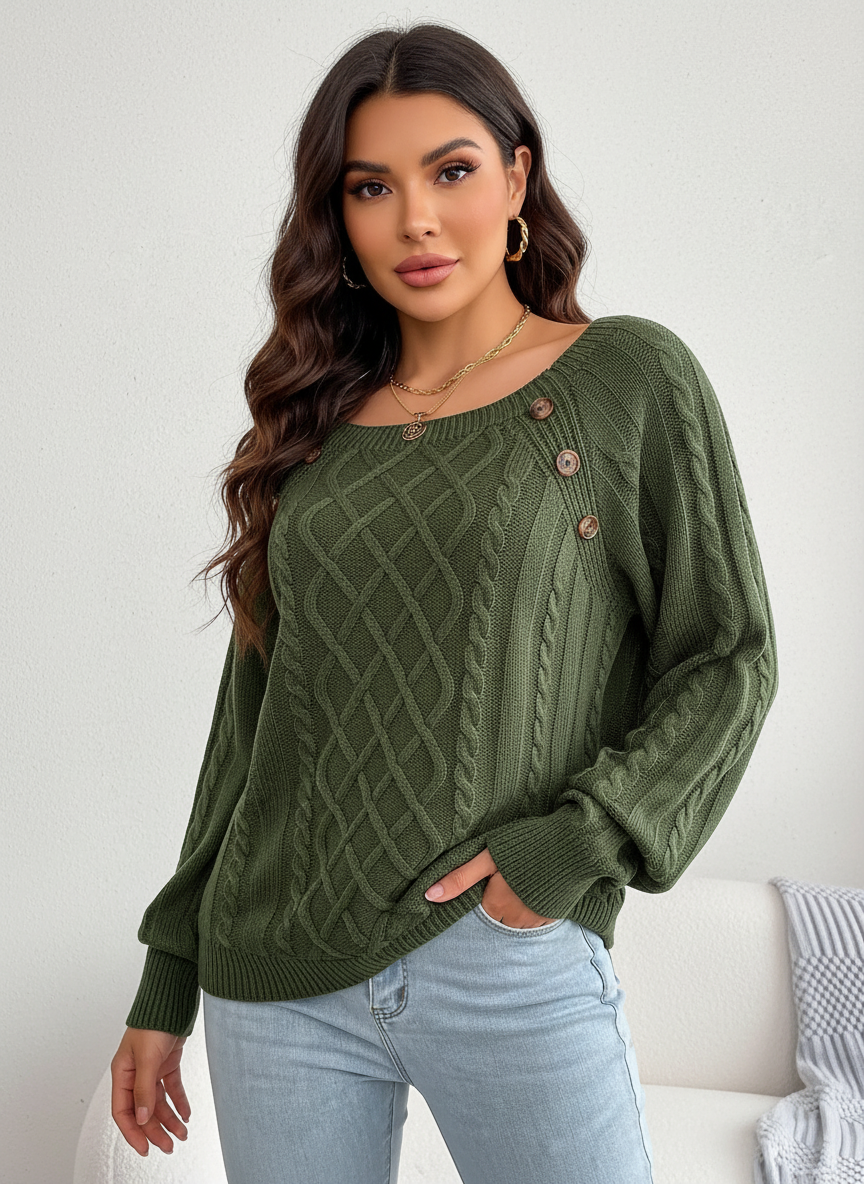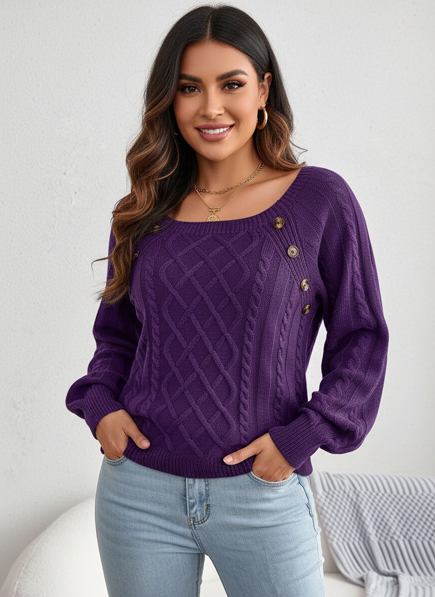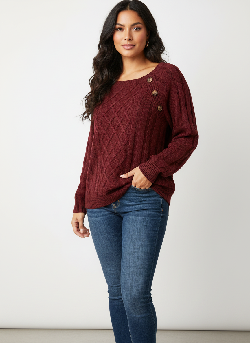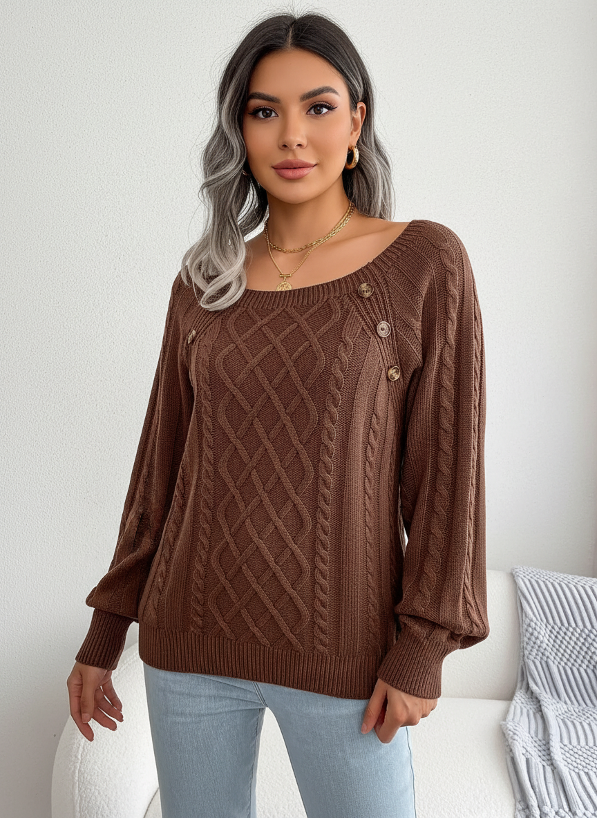 Elegante kabelgebreide damestrui met schouderknopen – Amélie