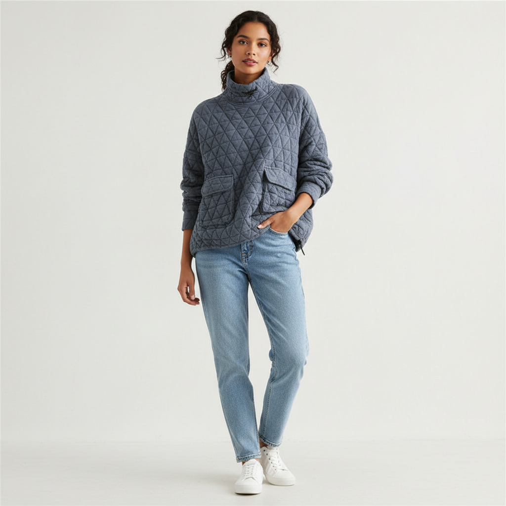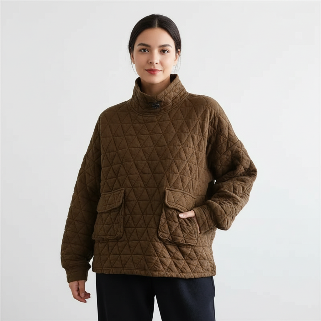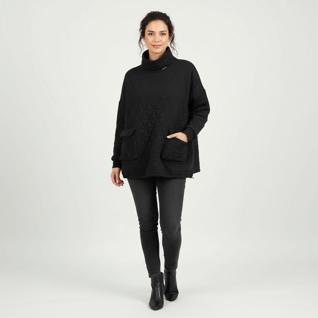 Deze pullover is ontworpen voor dagen waarop je warmte en comfort wilt combineren met een eigentijdse look. Het gewatteerde ontwerp voelt zacht en behaaglijk aan, terwijl de losse pasvorm zorgt voor een ontspannen, vrouwelijke uitstraling. De hoge kraag geeft het geheel een moderne touch en maakt dit item perfect voor koelere dagen, zowel thuis als onderweg.