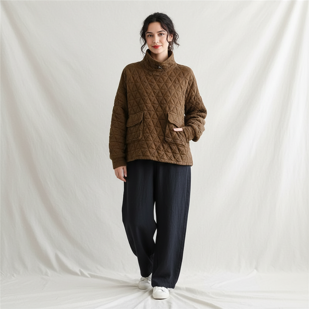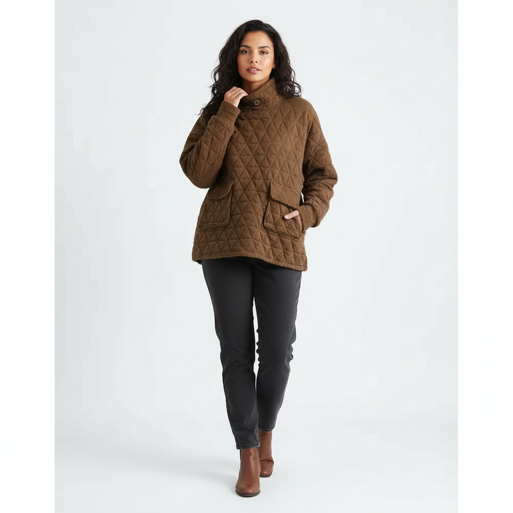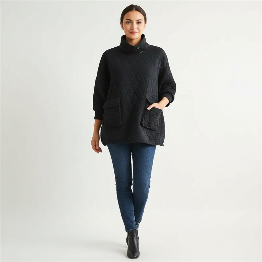 Deze pullover is ontworpen voor dagen waarop je warmte en comfort wilt combineren met een eigentijdse look. Het gewatteerde ontwerp voelt zacht en behaaglijk aan, terwijl de losse pasvorm zorgt voor een ontspannen, vrouwelijke uitstraling. De hoge kraag geeft het geheel een moderne touch en maakt dit item perfect voor koelere dagen, zowel thuis als onderweg.