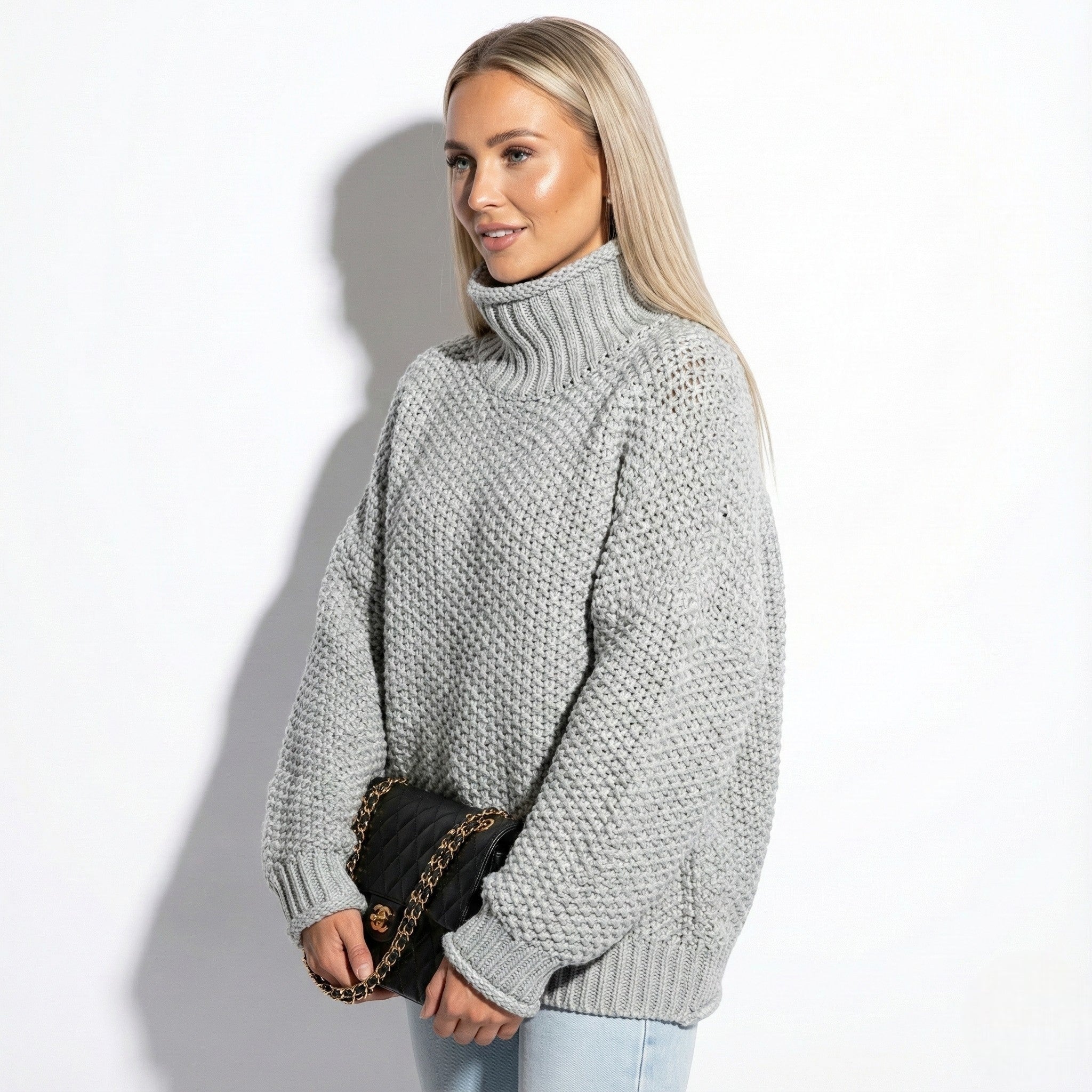 Grofgebreide damestrui met hoge kraag en structuur