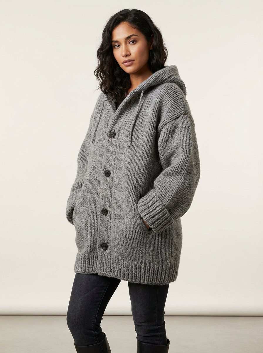 Dit item voelt als een zachte omhelzing op koudere dagen. De grove knitstructuur en relaxte vorm zorgen voor een comfortabele fit, terwijl de capuchon en lengte een moderne, eigentijdse uitstraling geven. Ideaal om te layeren en perfect voor dagen waarop je comfort en stijl naadloos wilt combineren.