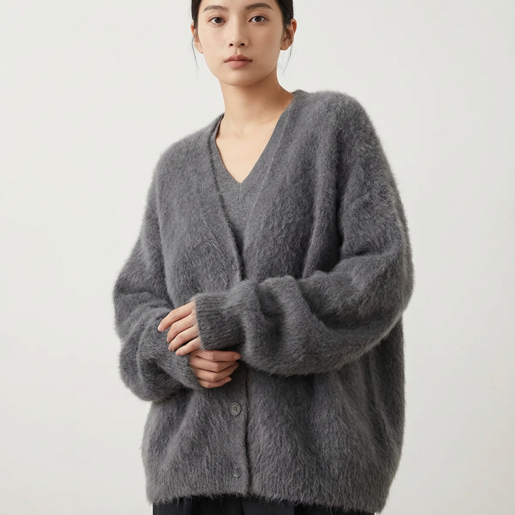 Deze zachte gebreide cardigan omhult je in warmte en verfijning. De luchtige, fluffy structuur geeft een rijke uitstraling, terwijl de ontspannen pasvorm zorgt voor moeiteloos draagcomfort. Perfect om nonchalant over één schouder te dragen of elegant gesloten te stylen. Ideaal voor rustige dagen thuis, maar net zo geschikt voor een stijlvolle look buitenshuis.