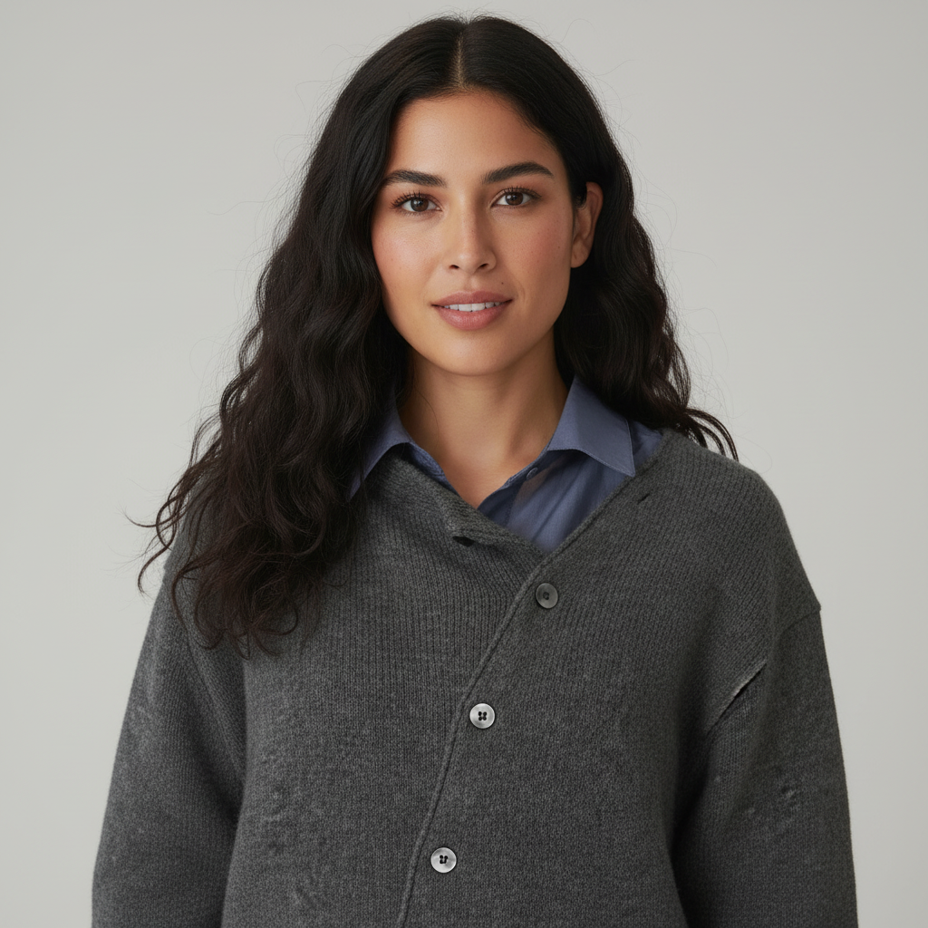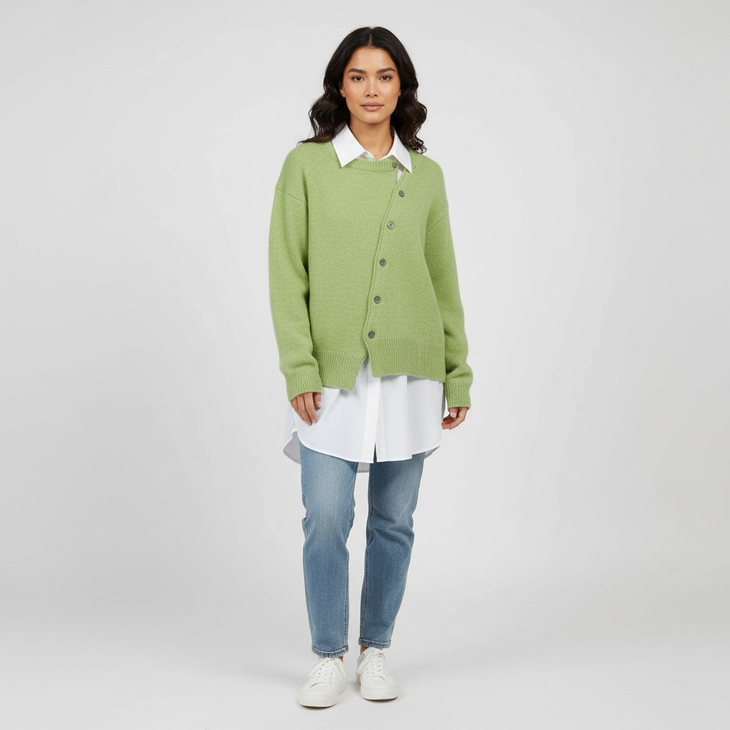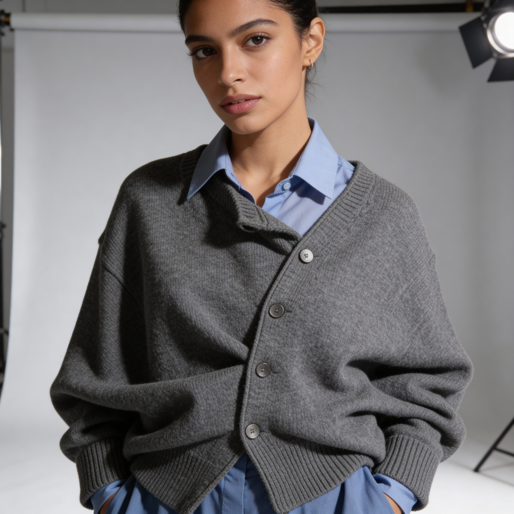 Een ontspannen cardigan die warmte en eenvoud op een stijlvolle manier samenbrengt.