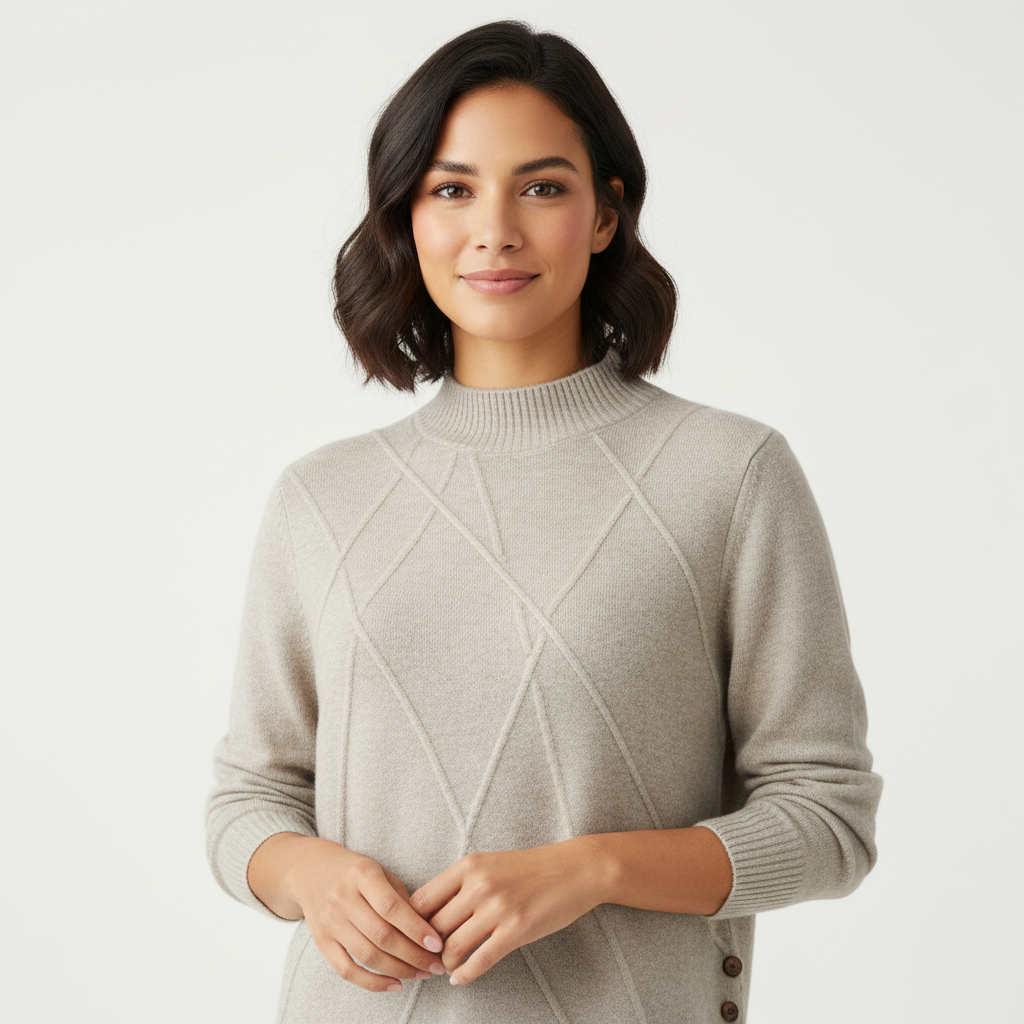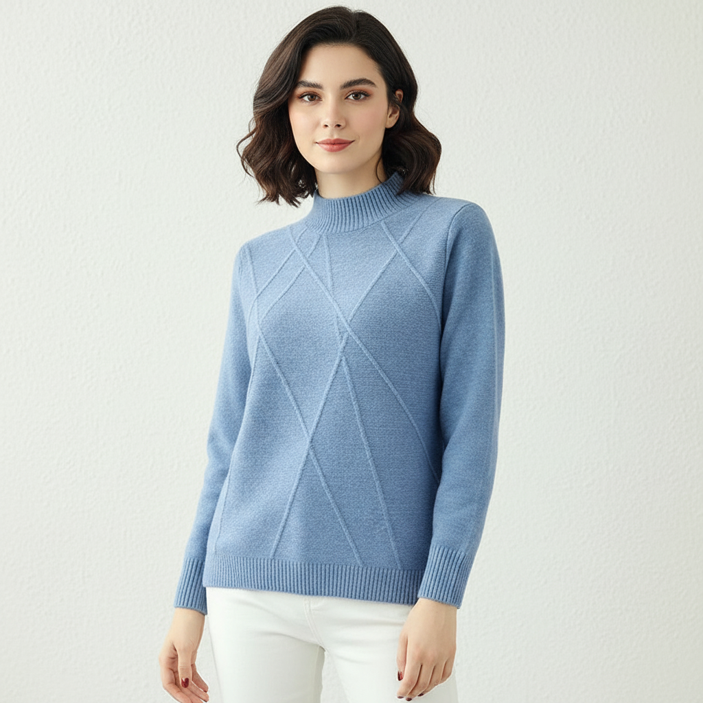 Dit ontwerp is gemaakt voor momenten waarop comfort en uitstraling moeiteloos samenkomen. De fijne breistructuur voelt zacht aan op de huid en valt soepel langs het lichaam, terwijl het subtiele patroon en de hoge hals zorgen voor een rustige, verfijnde look. Een tijdloos item dat je gemakkelijk inpast in je dagelijkse garderobe.