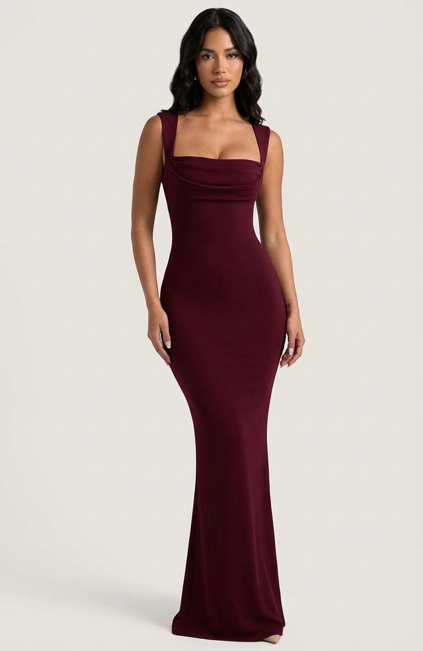 Deze lange jurk in een diepe bordeaux tint straalt pure elegantie uit. Het ontwerp volgt het lichaam op een verfijnde manier en benadrukt de vrouwelijke vormen zonder overdaad. De vierkante halslijn en brede schouderbanden geven deze jurk een tijdloze, chique uitstraling die perfect past bij formele momenten en bijzondere gelegenheden.