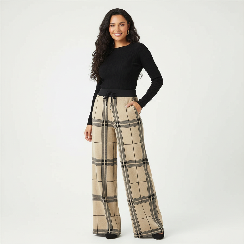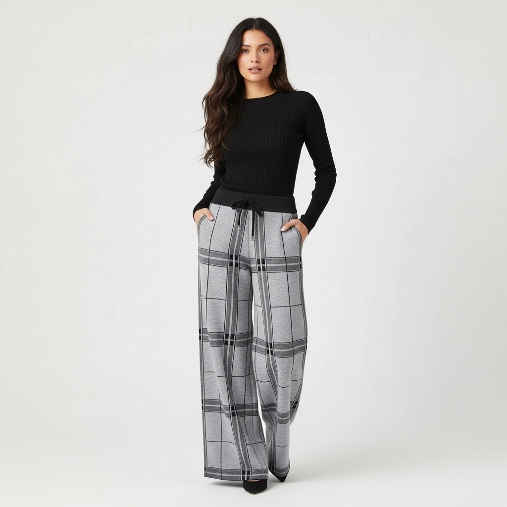 - Wijde pijpen met tijdloze plaid: verlengen visueel de benen en geven effortless chic.