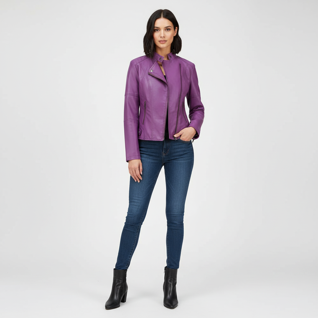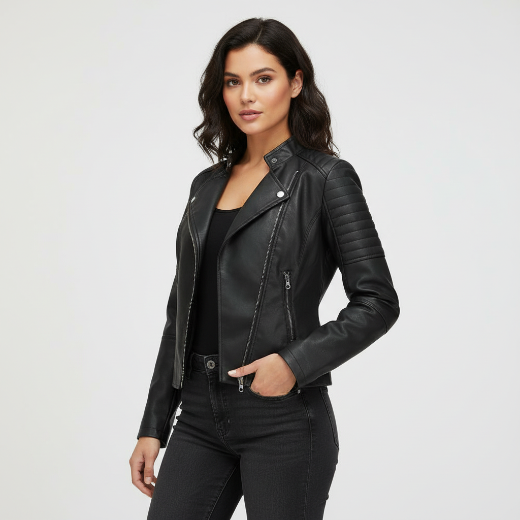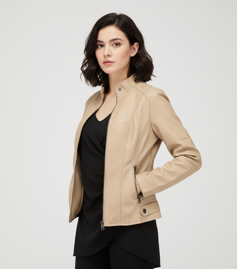 Dit damesjack met mao-kraag is ontworpen voor een moderne, zelfverzekerde uitstraling. De strakke lijnen en verfijnde afwerking zorgen voor een elegante look die moeiteloos past bij zowel casual als geklede outfits. Het soepele imitatie-leer voelt comfortabel aan en geeft het jasje een luxe uitstraling zonder in te leveren op draaggemak.