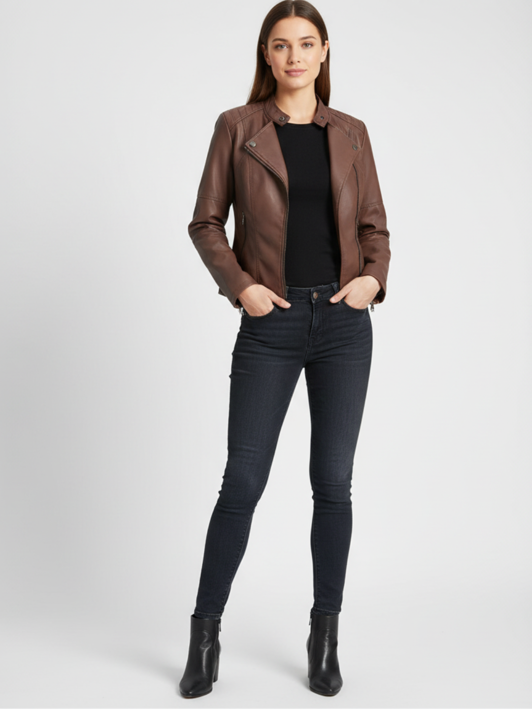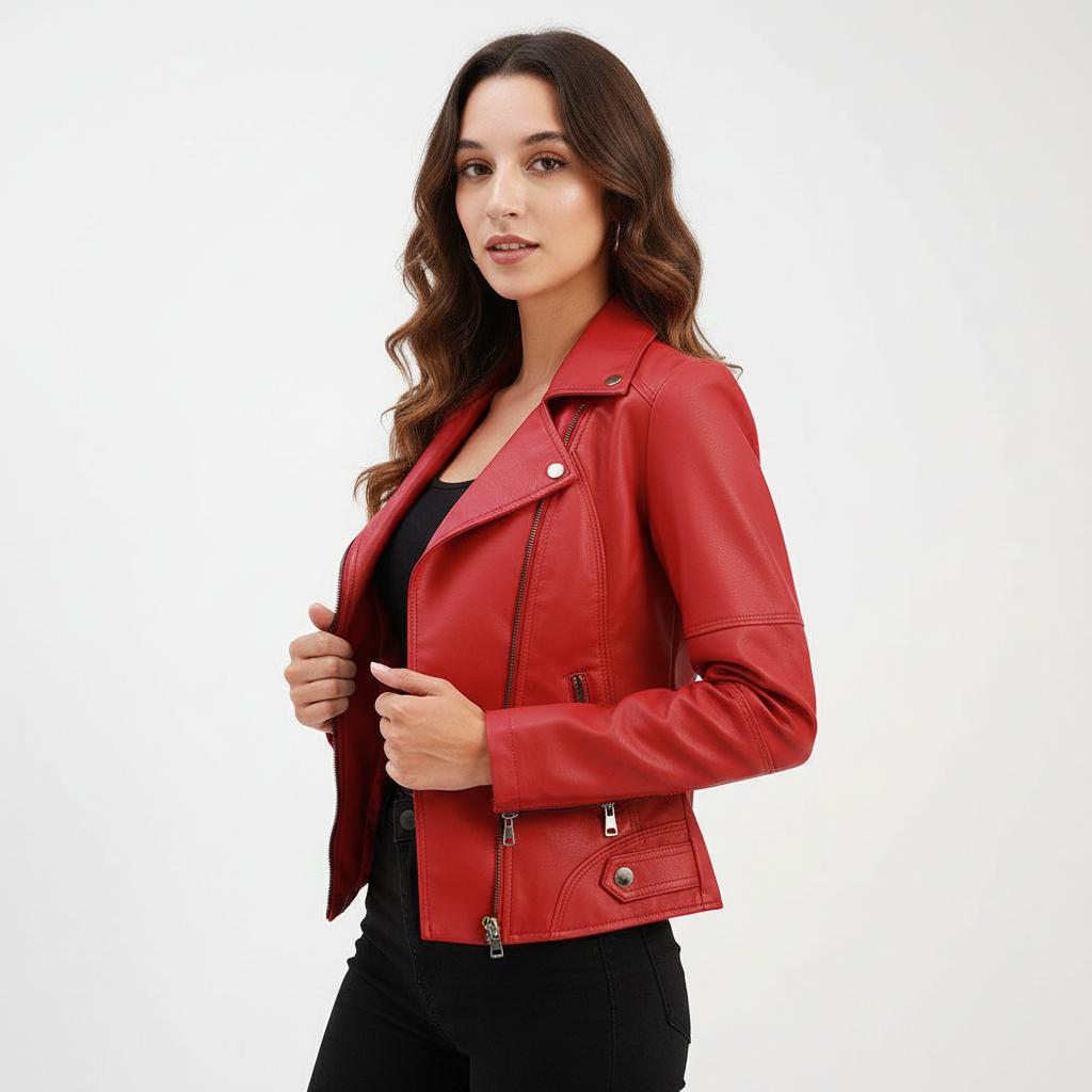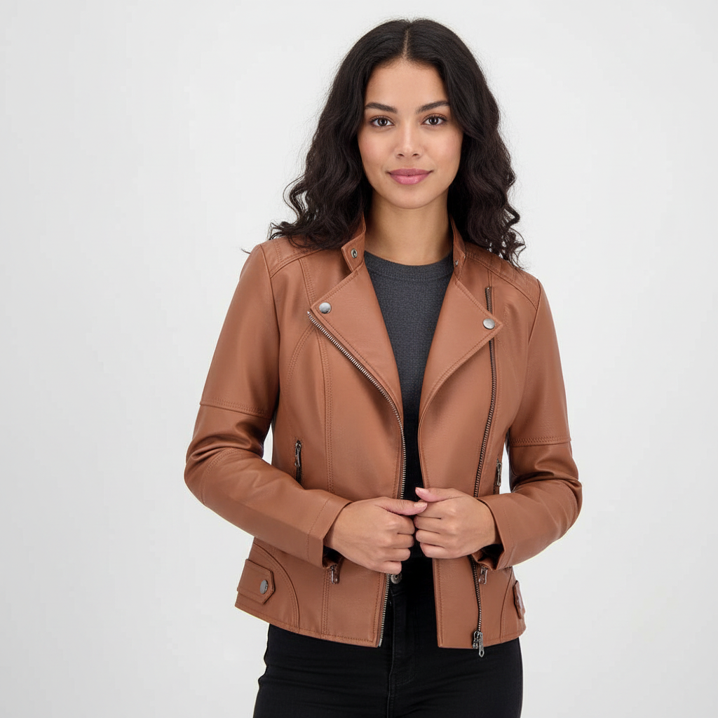 Dit damesjack met mao-kraag is ontworpen voor een moderne, zelfverzekerde uitstraling. De strakke lijnen en verfijnde afwerking zorgen voor een elegante look die moeiteloos past bij zowel casual als geklede outfits. Het soepele imitatie-leer voelt comfortabel aan en geeft het jasje een luxe uitstraling zonder in te leveren op draaggemak.