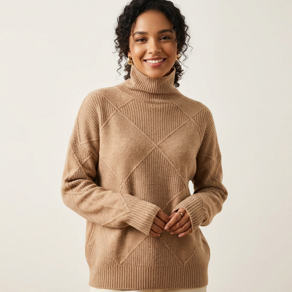 Deze coltrui is de ultieme combinatie van warmte en verfijning. De zachte knit voelt heerlijk comfortabel aan op de huid en omhult je met subtiele luxe tijdens frisse dagen. De hoge col geeft een stijlvolle, zelfverzekerde uitstraling, terwijl het geometrische ribpatroon een modern accent toevoegt. De pasvorm valt soepel langs het lichaam en creëert een elegant silhouet zonder strak aan te voelen – perfect voor zowel dagelijkse momenten als een chique avondlook.