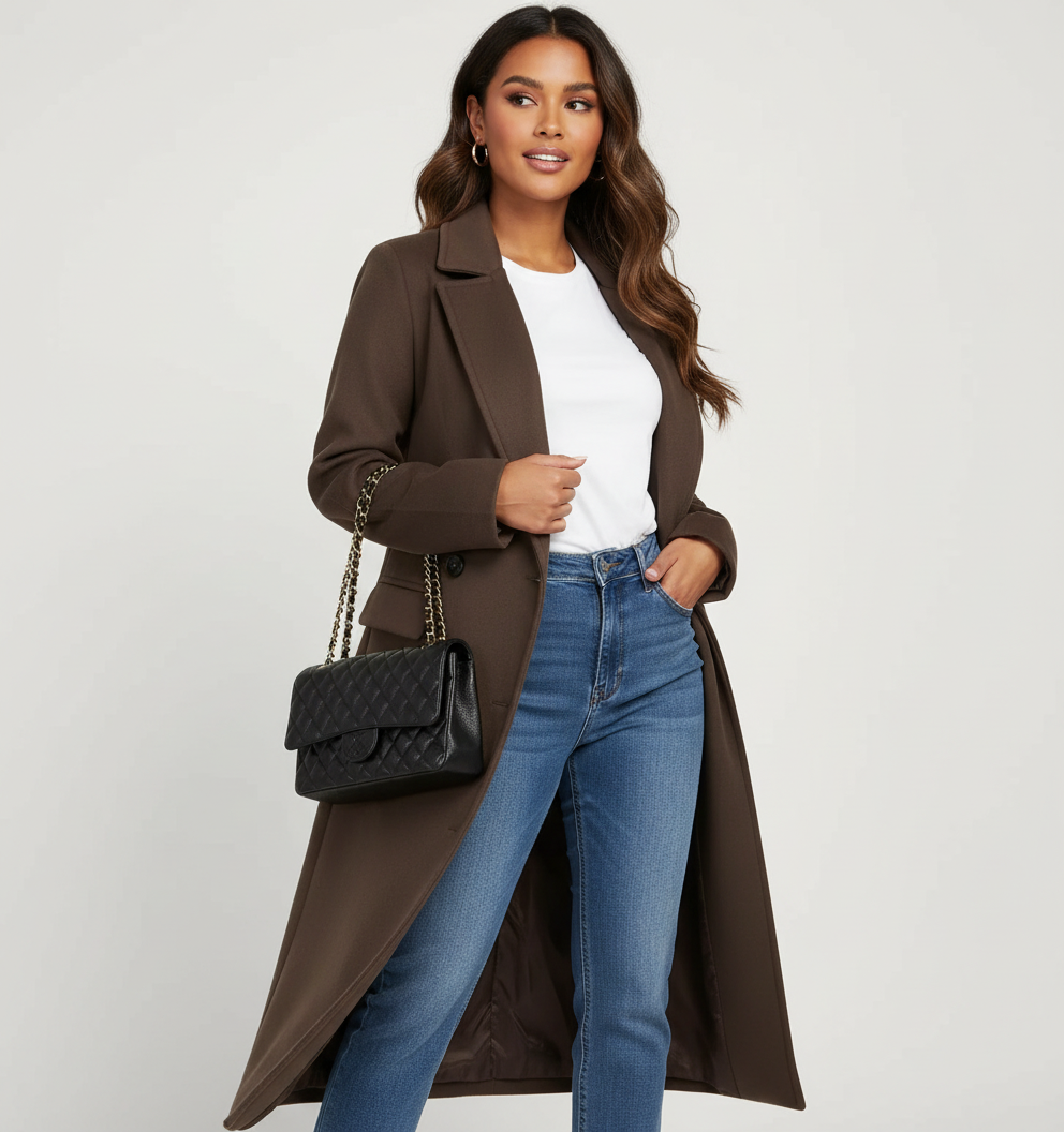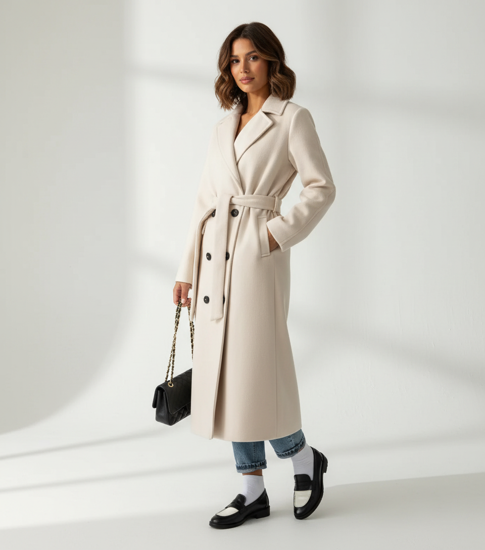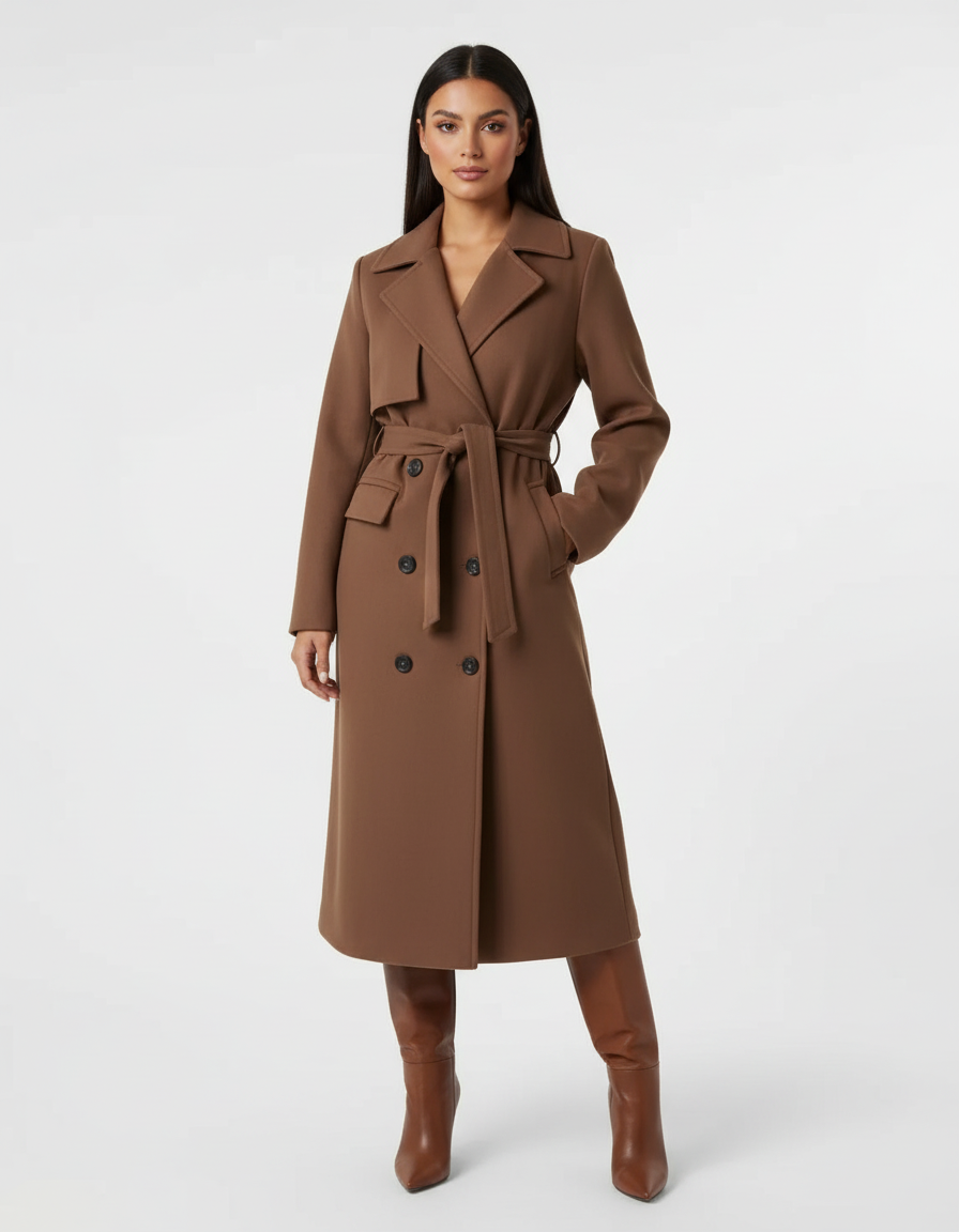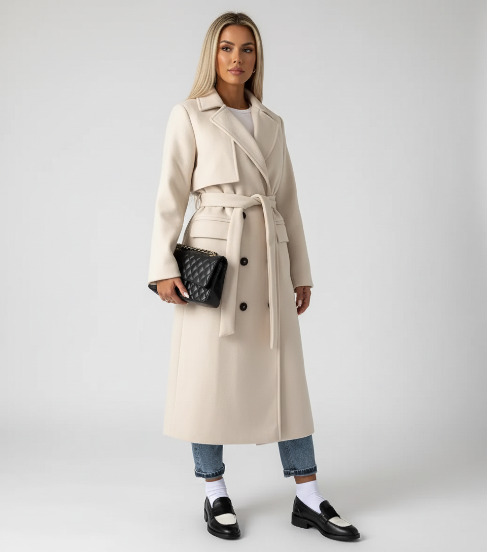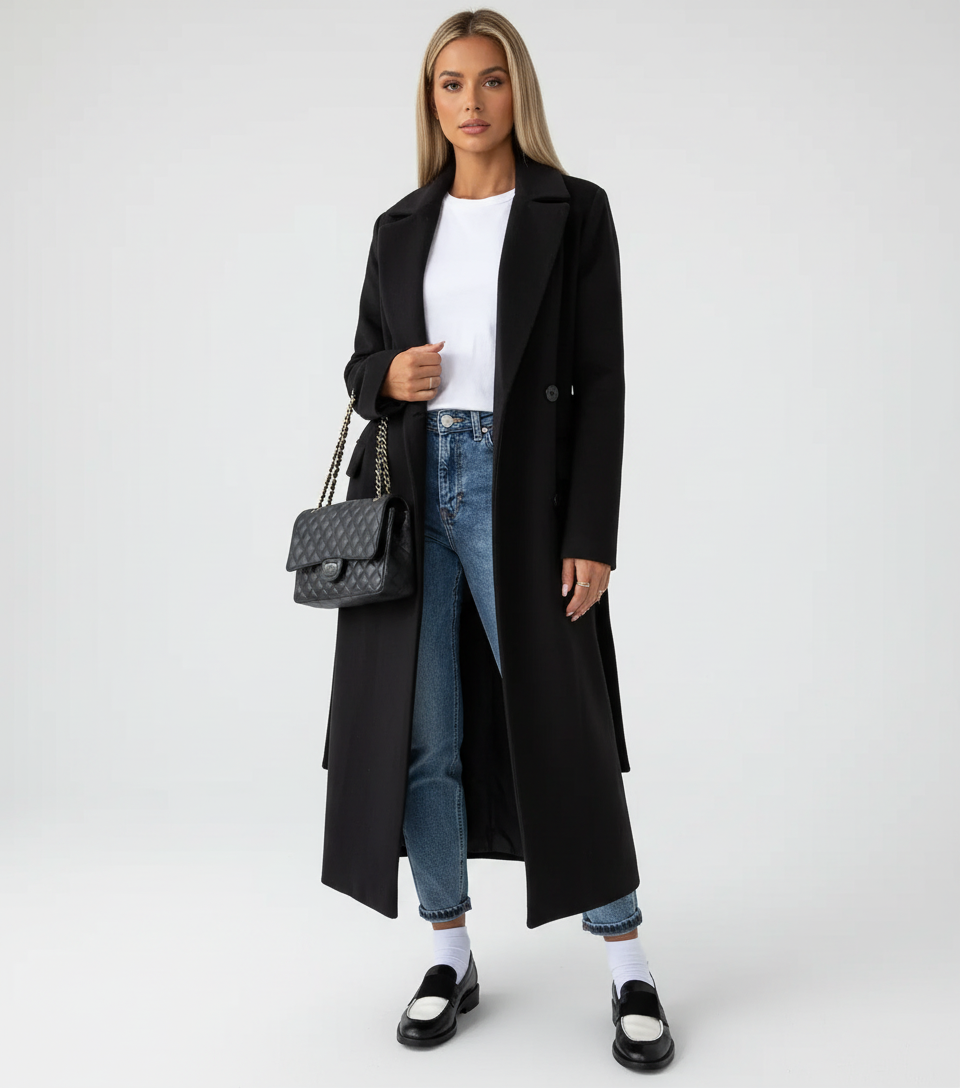 Deze lange winterjas voor dames is ontworpen voor koude dagen waarop uitstraling net zo belangrijk is als comfort. De double-breasted sluiting en bijpassende ceintuur creëren een mooi gedefinieerd silhouet, terwijl de lange lengte zorgt voor extra warmte en een tijdloze, elegante look. Een stijlvol ontwerp dat perfect past bij dagelijkse momenten, werkafspraken en verfijnde city looks.