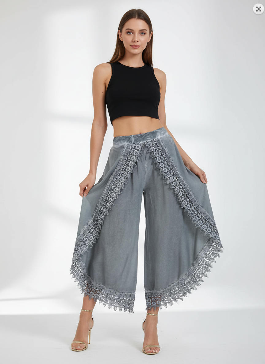 • Decoratieve details: De verfijnde kanten banen en sierlijke afwerking geven de broek een romantische, elegante uitstraling.