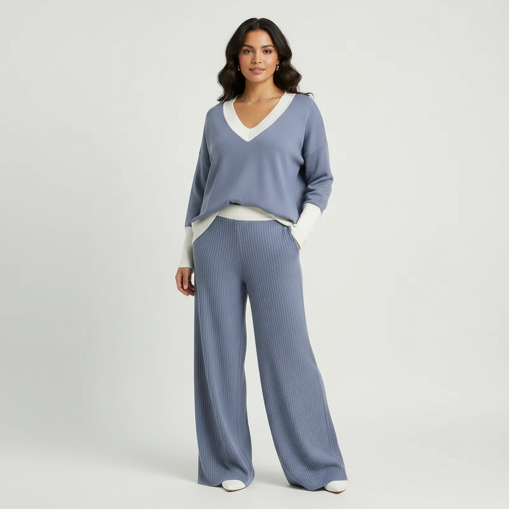 Zachte luxe die met elke stap meebeweegt. Deze twee-stuks set combineert warmte met een luchtige elegantie, terwijl de vloeiende snit en brede pijp zacht en flatterend vallen. Ideaal om te ontspannen thuis maar ook chic op straat.