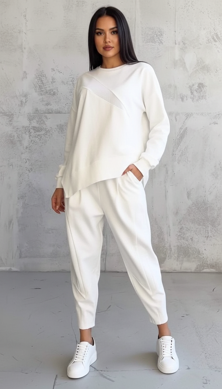 Dit tweedelige set combineert comfort en eenvoud in een moderne, ontspannen look. De losvallende top met ronde hals en de bijpassende broek zorgen samen voor een tijdloos silhouet dat je moeiteloos draagt van thuis tot onderweg. De zachte stof voelt prettig aan op de huid en maakt dit ontwerp ideaal voor dagen waarop je comfortabel én verzorgd voor de dag wilt komen.