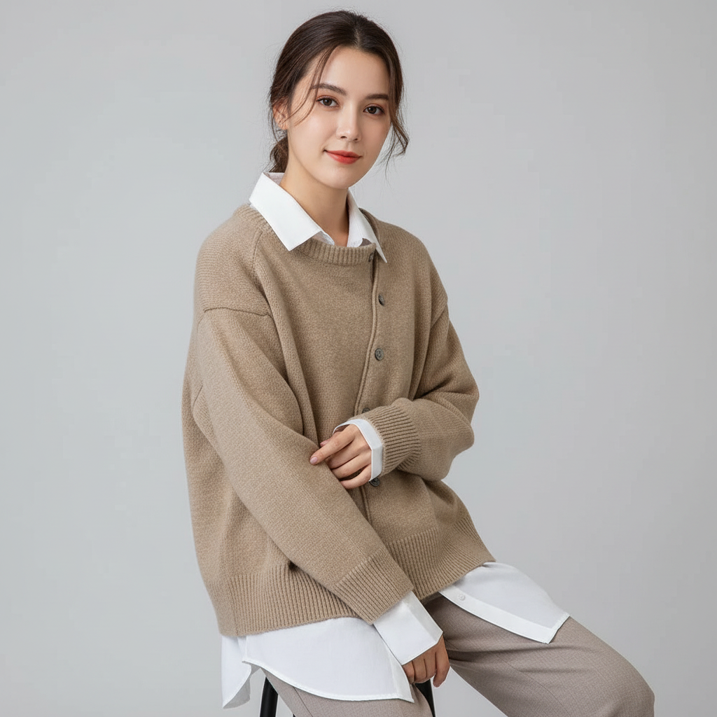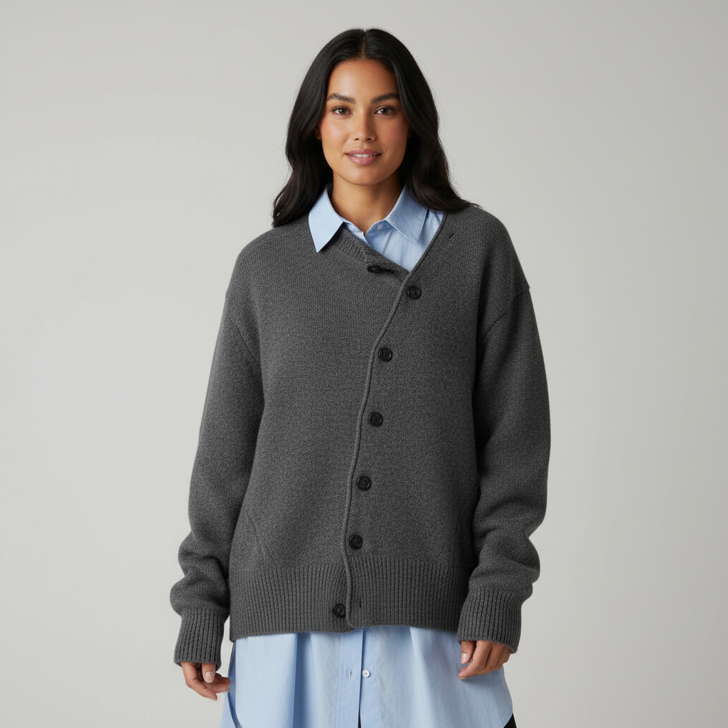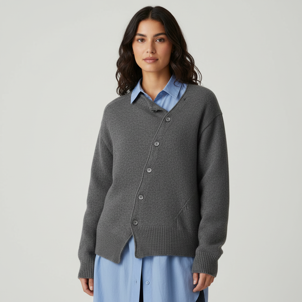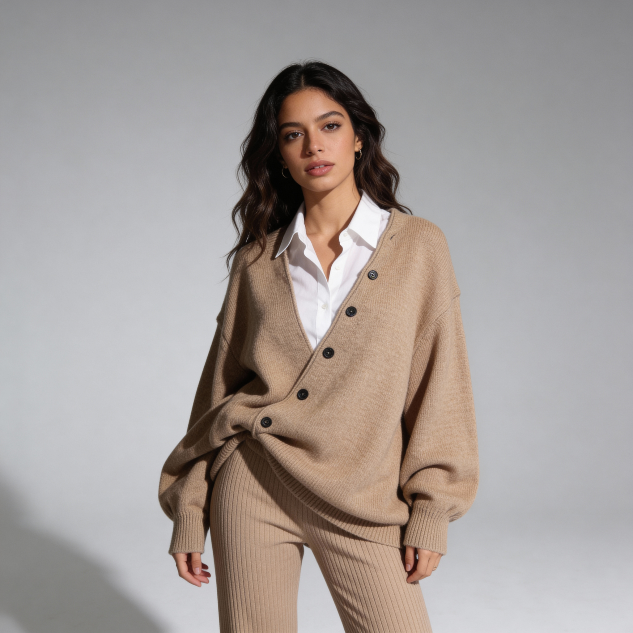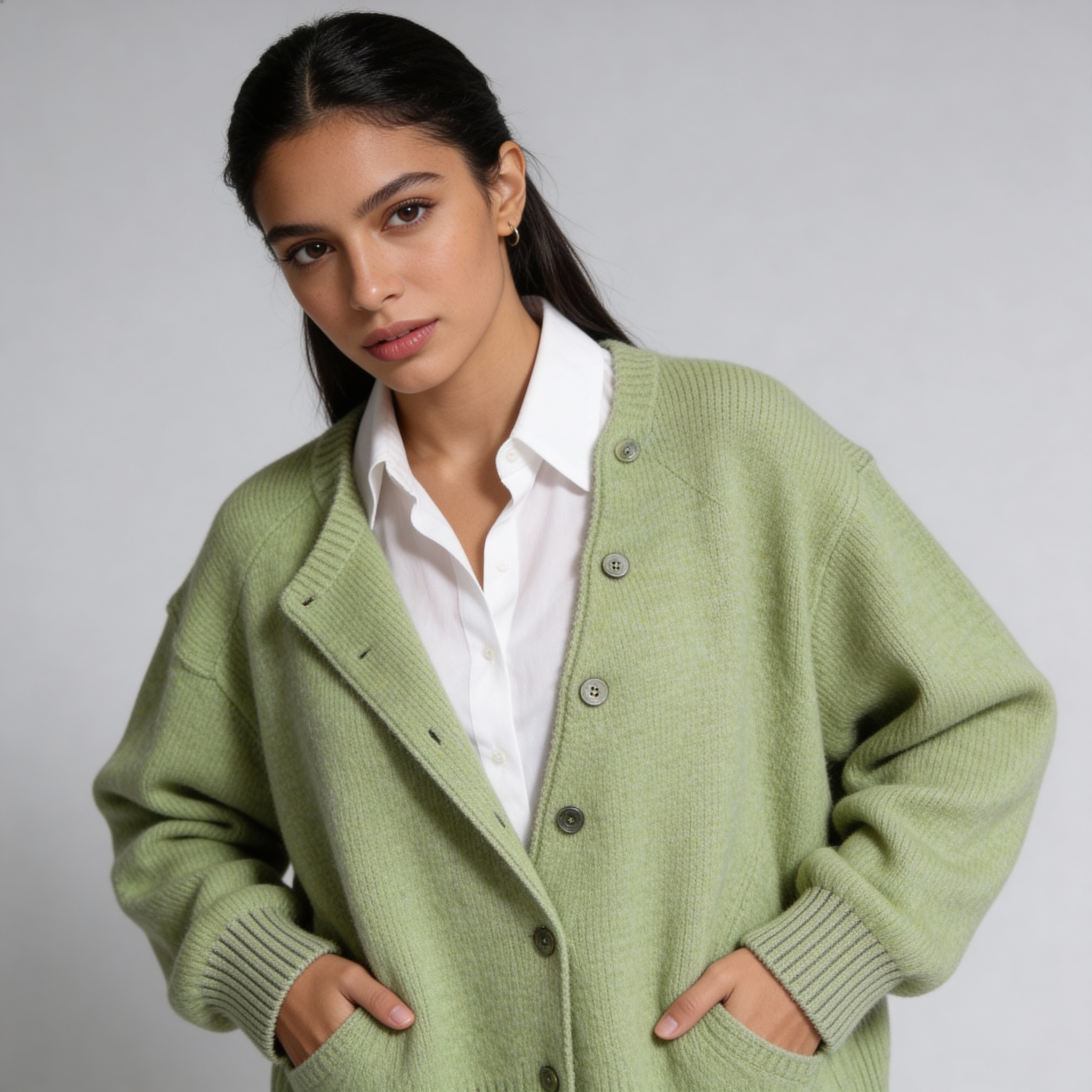 Een ontspannen cardigan die warmte en eenvoud op een stijlvolle manier samenbrengt.