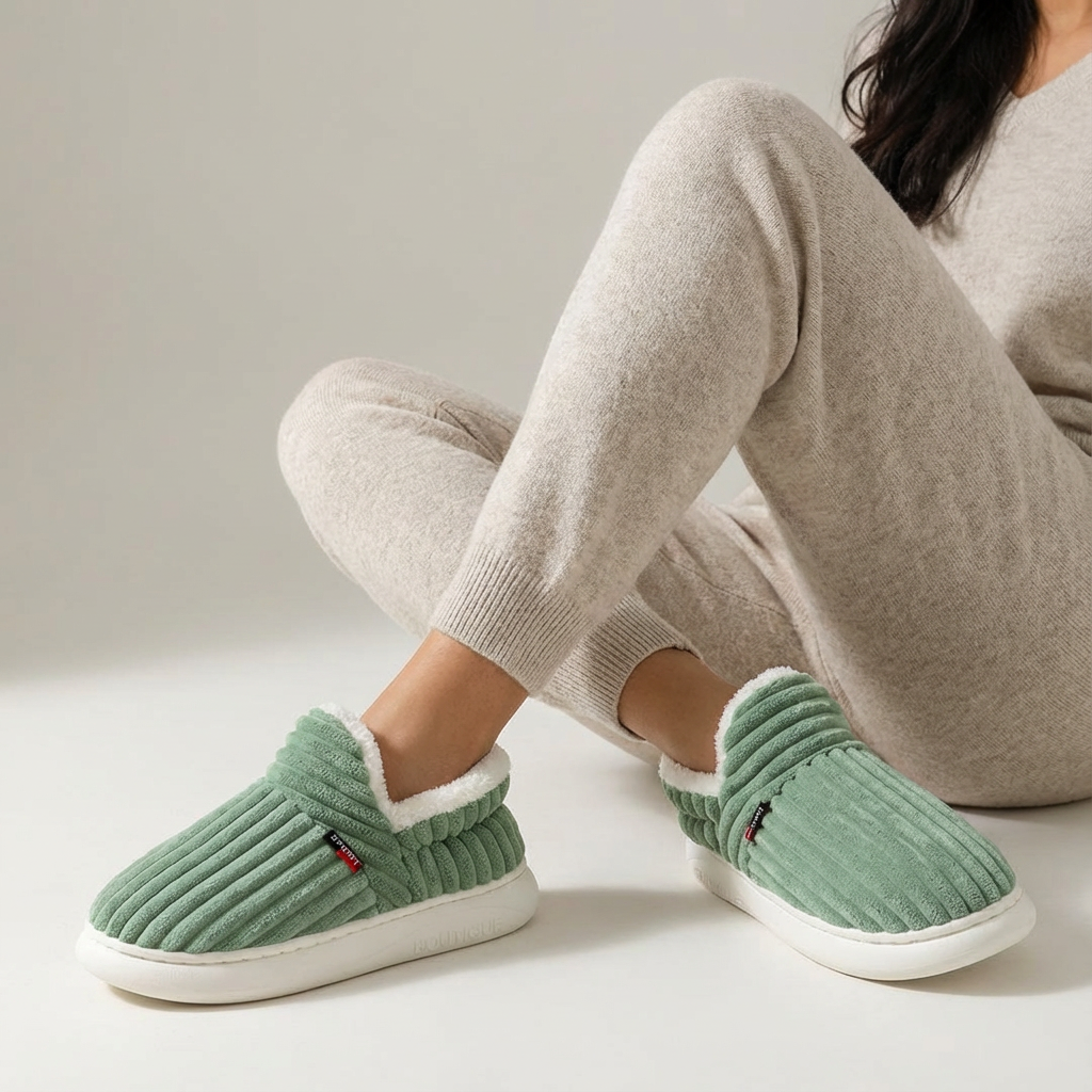 De stevige zool zorgt voor stabiliteit en maakt het mogelijk om ook kort naar buiten te lopen. Dankzij de gesloten vorm blijven je voeten goed warm en ondersteund, terwijl het lichte gewicht zorgt voor moeiteloos draagcomfort gedurende de dag.